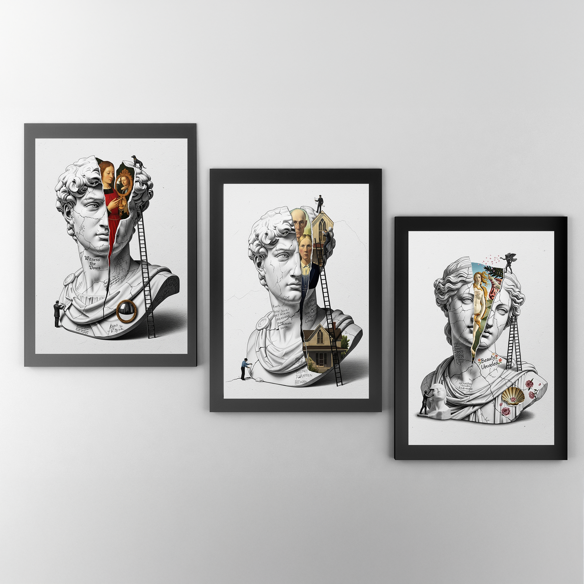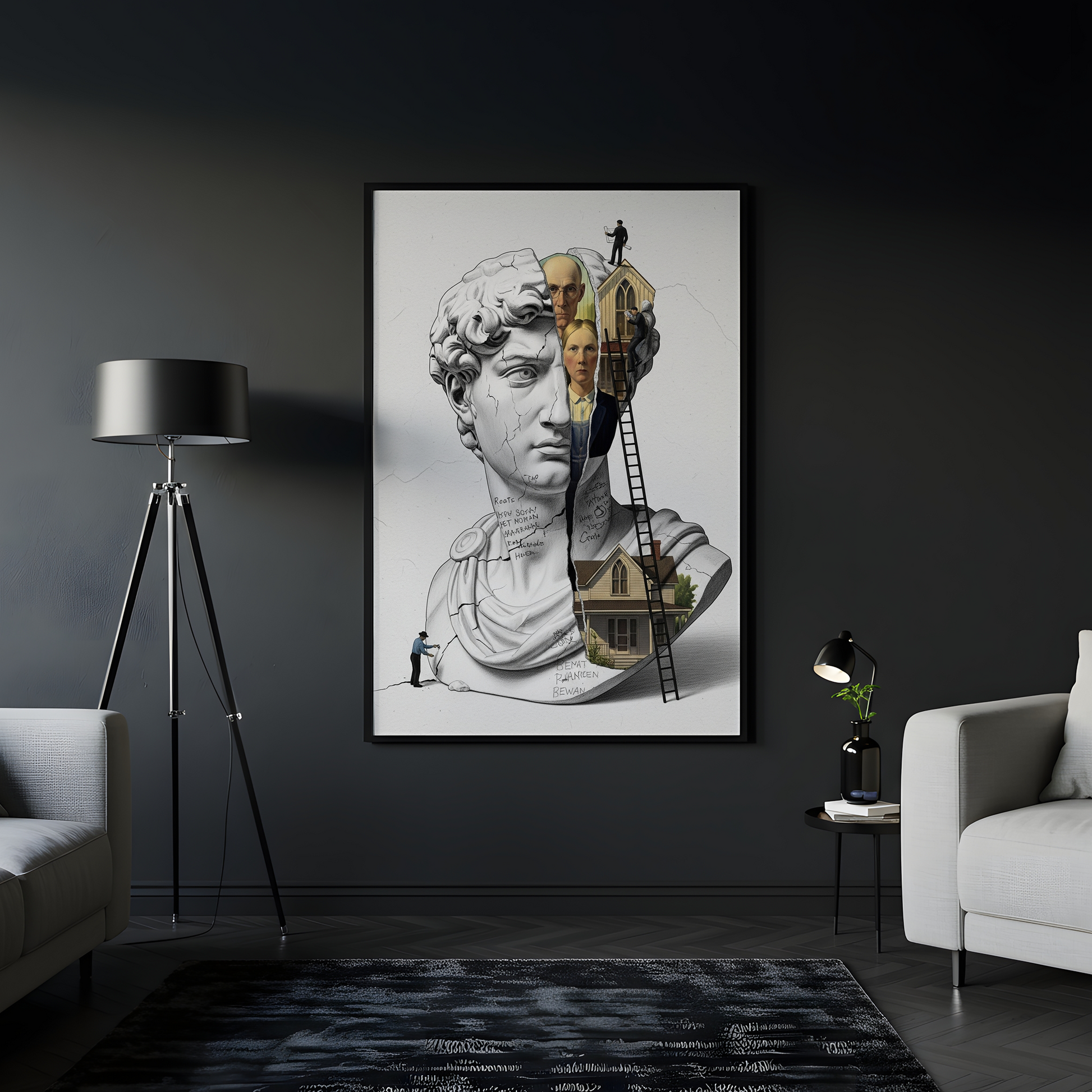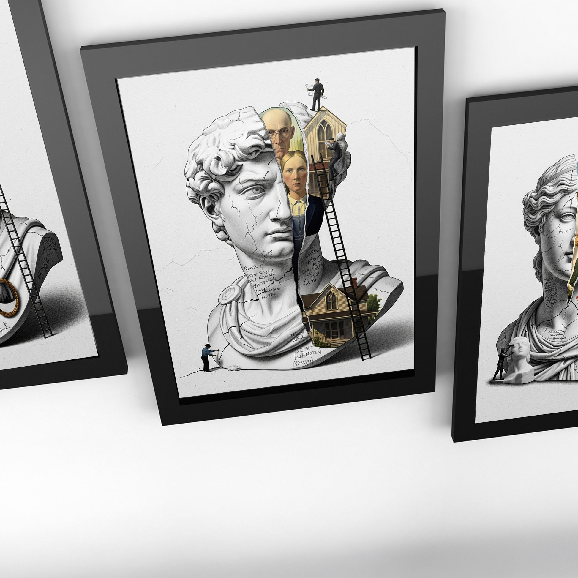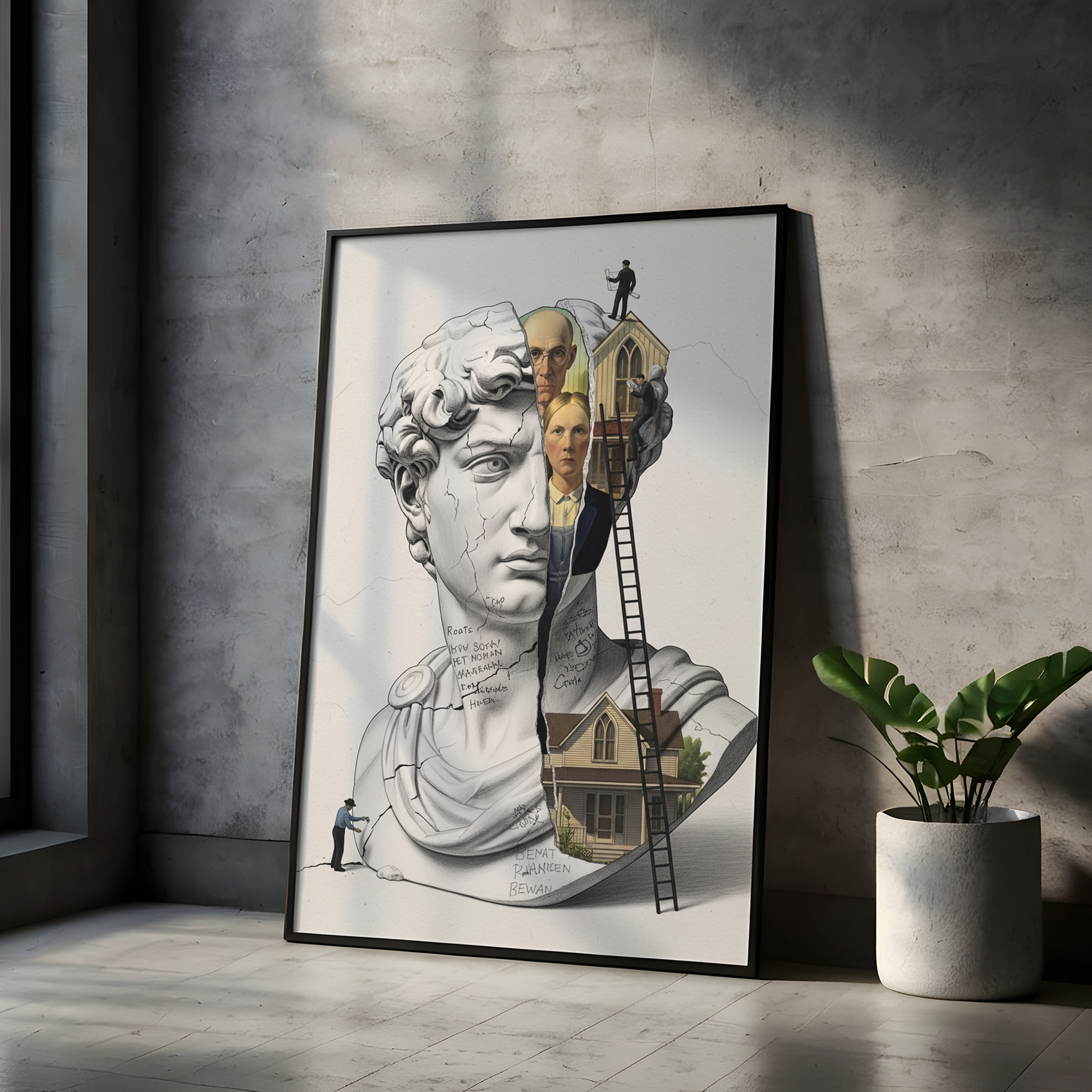Bu orijinal "Altered Art" (Değiştirilmiş Sanat) kolajı, idealize edilmiş bir güzellik anlayışının derinliklerindeki "kökleri" ve kültürel mirası sorgular. Küçük figürler, bu klasik yapıyı adeta bir arkeolog gibi kazıyarak içindeki "American Gothic" evini ve portrelerini ortaya çıkarır.
