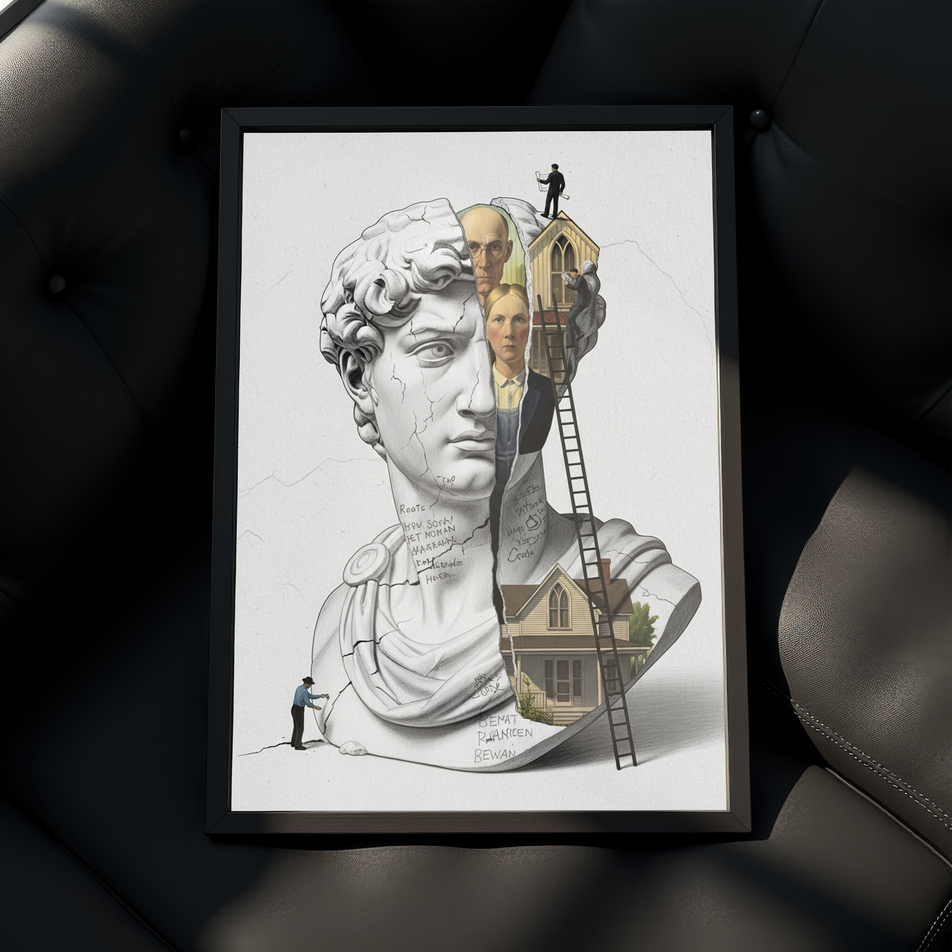 Luiff Art'ın bu entelektüel tasarımı, "Roots" (Kökler) temasıyla, klasik Batı sanatının (David/Apollo büstü) formunu, Amerikan Gotiği'nin (Grant Wood) ikonik mirasıyla birleştiriyor.