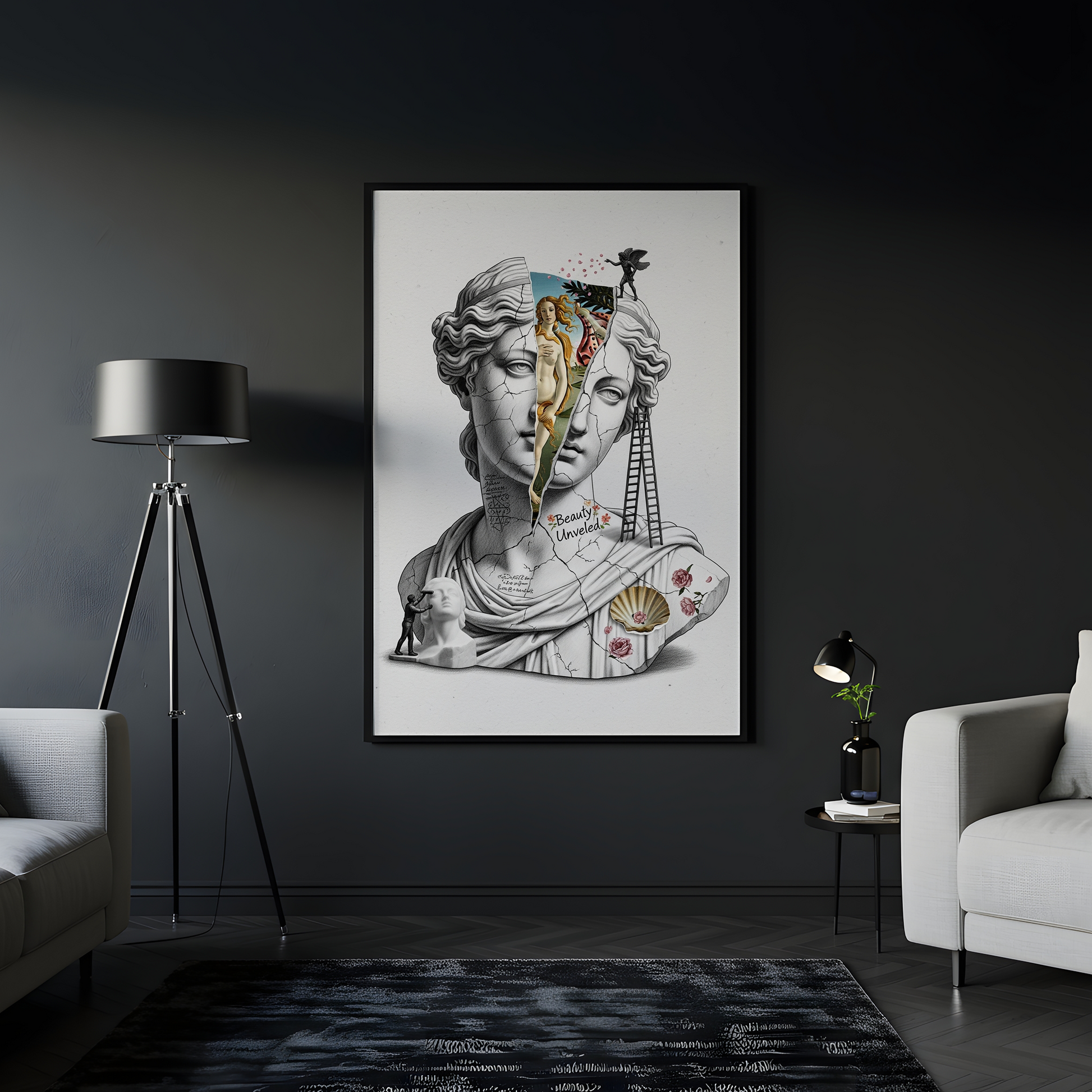 Luiff Art'ın bu zarif ve sofistike tasarımı, "Beauty Unveiled" (Güzellik Ortaya Çıktı) temasıyla, güzelliğin iki farklı ikonik formunu bir araya getiriyor: Klasik Venüs büstü ve Botticelli'nin "Venüs'ün Doğuşu".