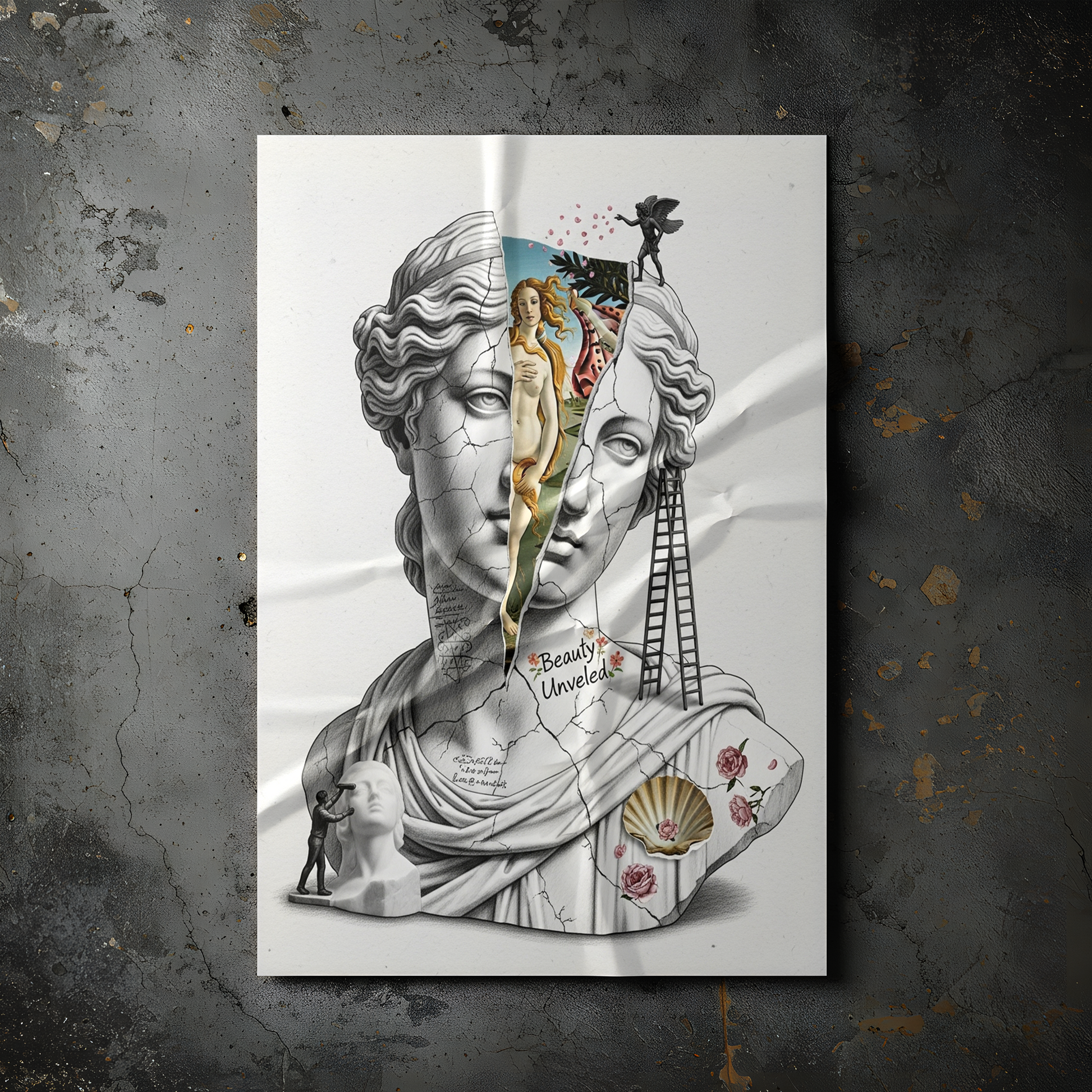 Bu orijinal "Altered Art" (Değiştirilmiş Sanat) kolajı, mermerin soğuk güzelliğinin içinde saklı olan Rönesans'ın yumuşak ve akıcı güzellik idealini sergiler. Büstün üzerindeki deniz kabuğu ve gül dövmeleri, bu "güzellik" arkeolojisini tamamlar.
