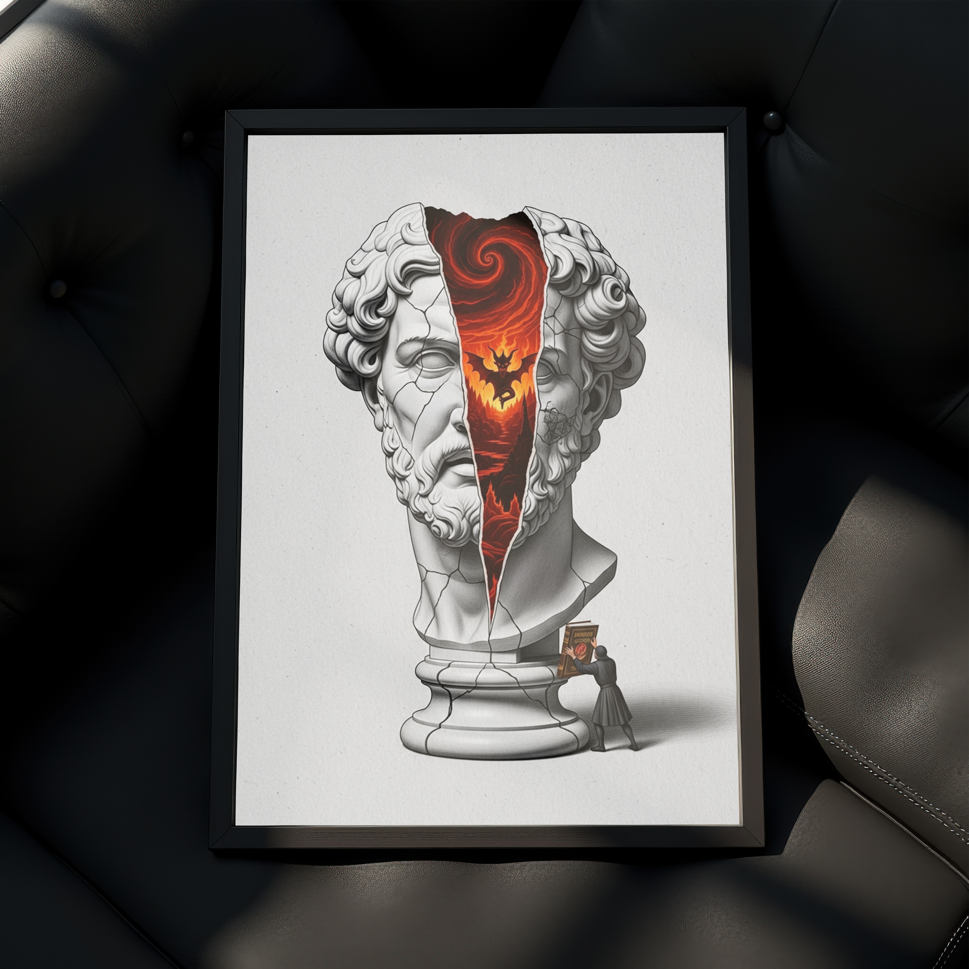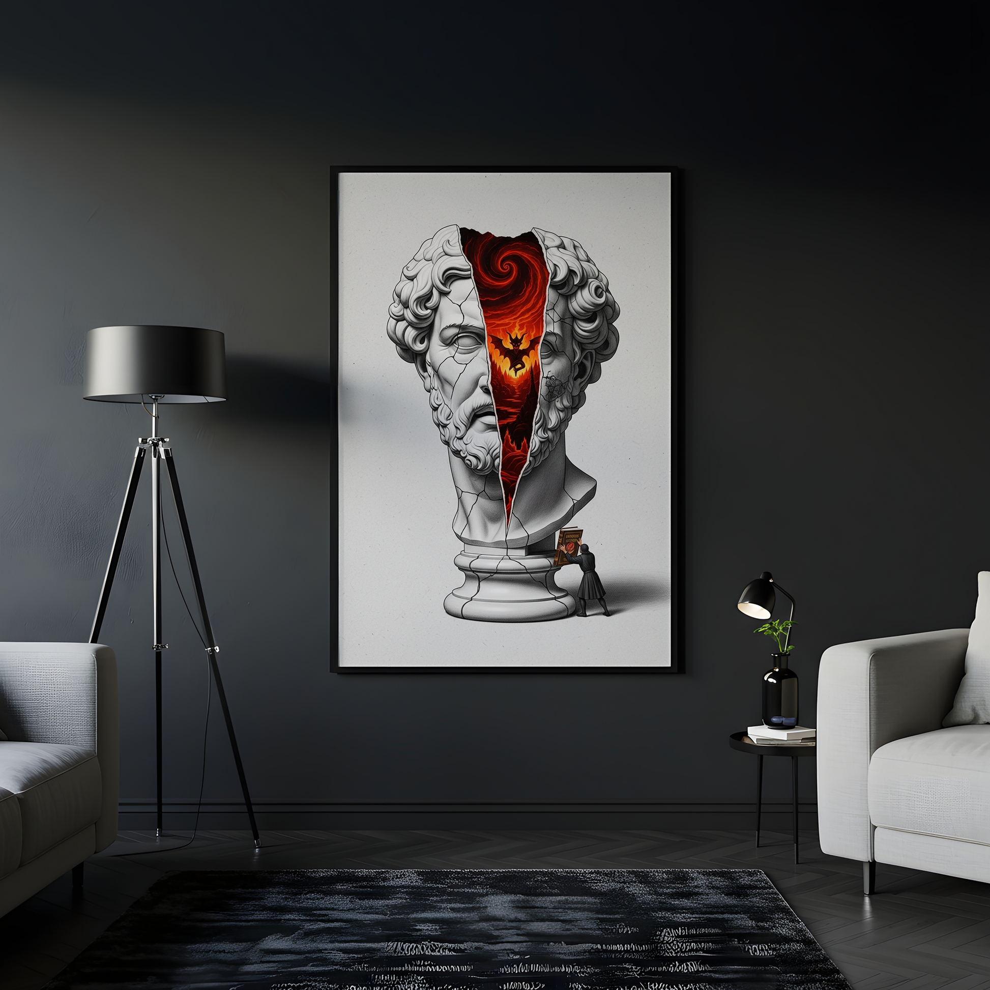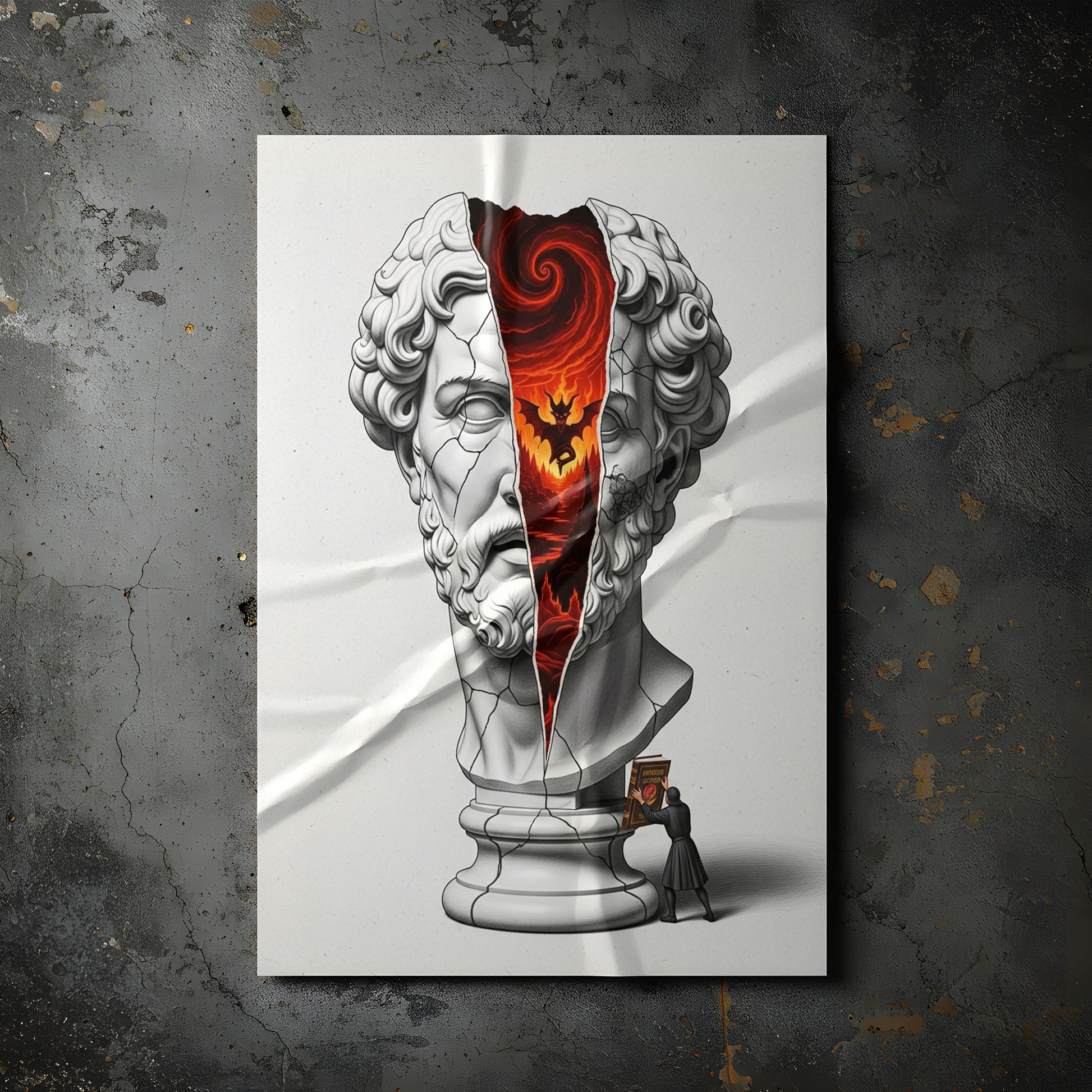 Luiff Art'ın bu karanlık ve gotik tasarımı, klasik tanrı büstünün (Zeus) düzenli formunu, "Cehennem"in (Inferno) kaotik ve ateşli girdabıyla parçalıyor.