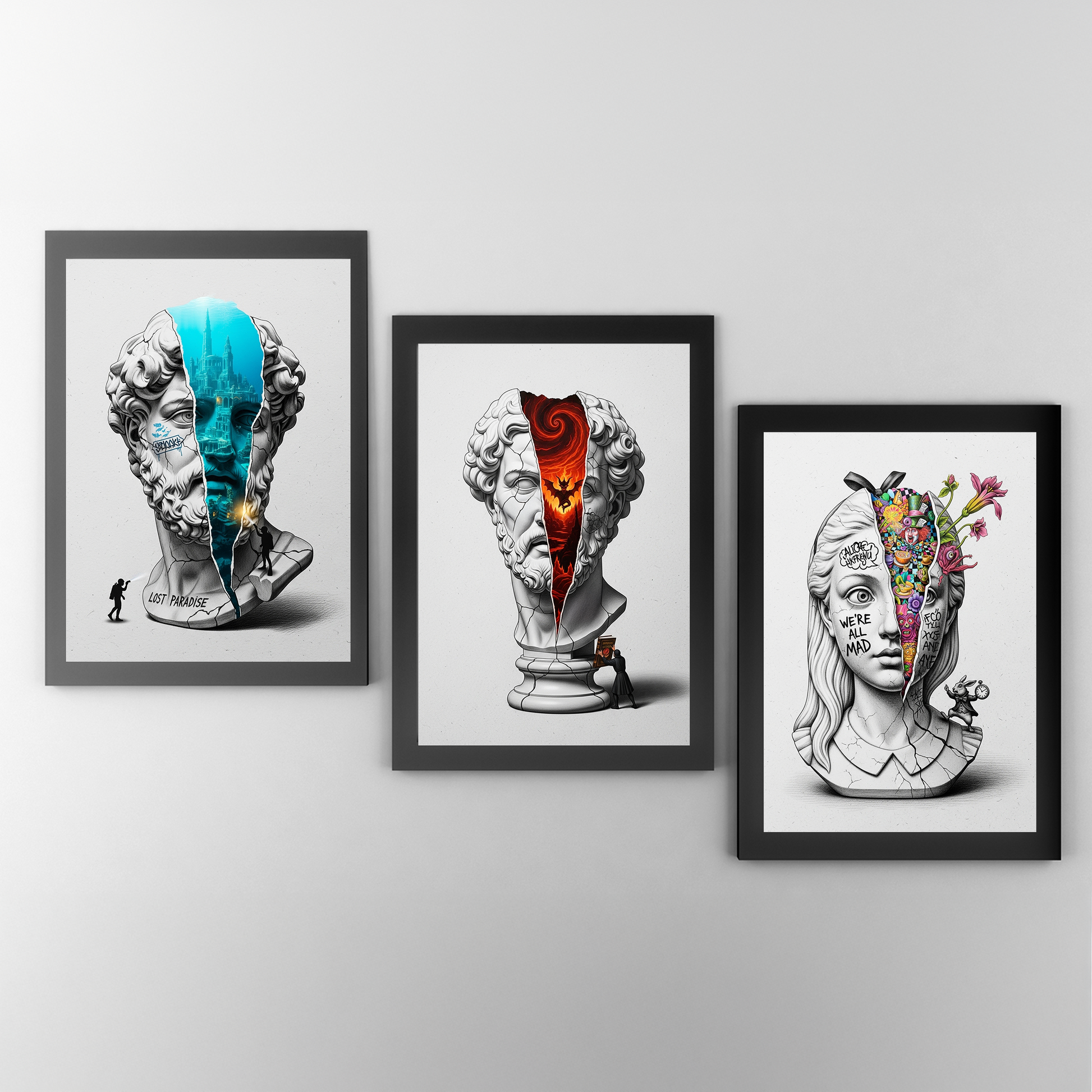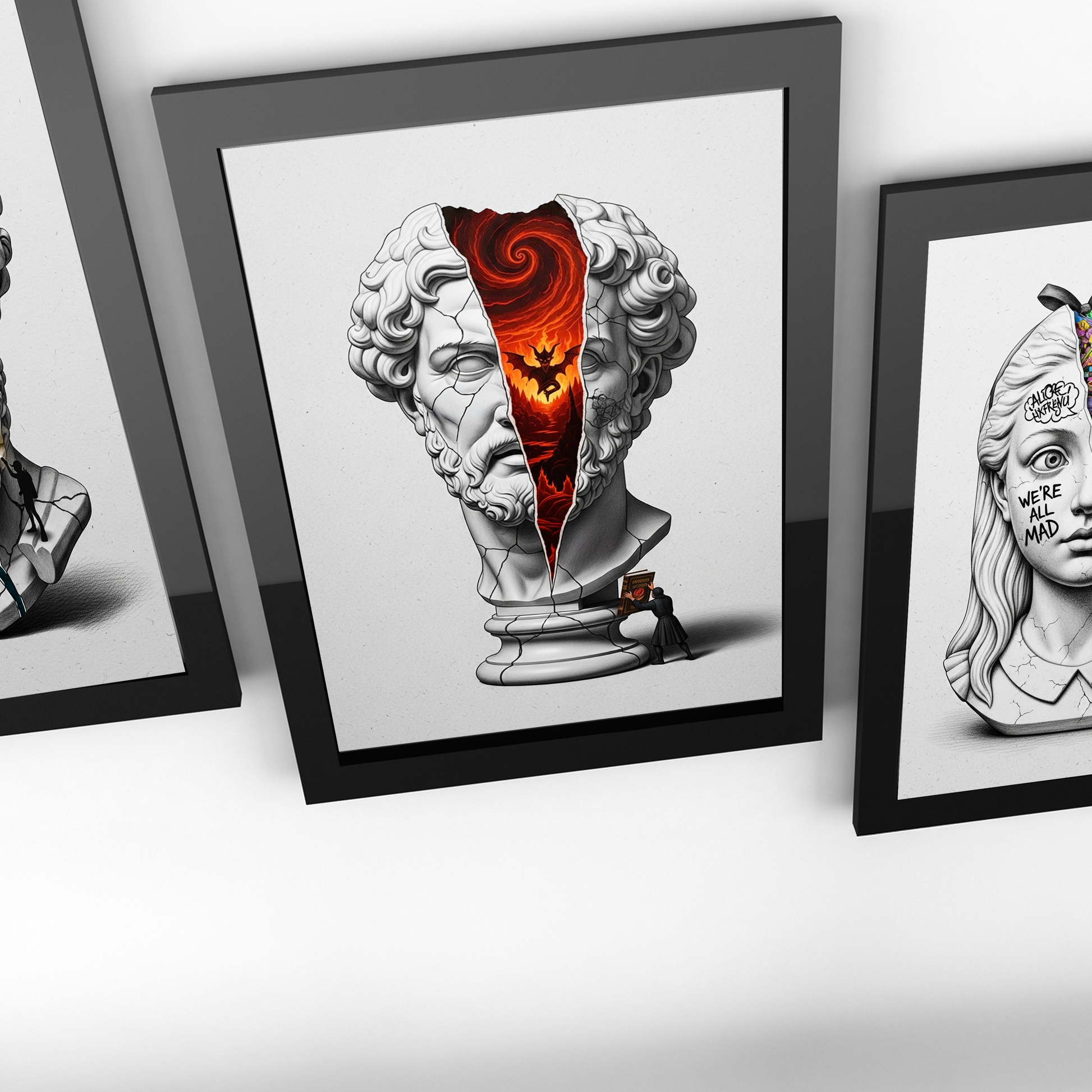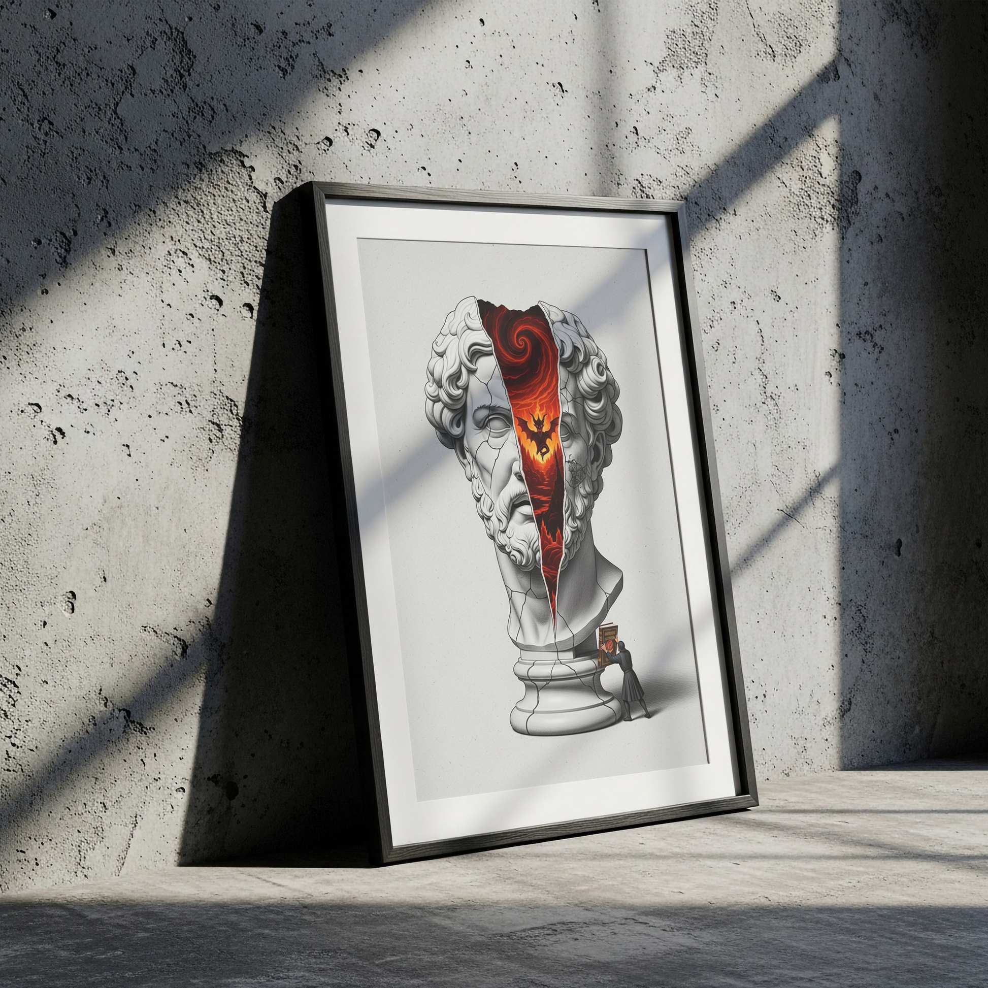 Luiff Art'ın bu karanlık ve gotik tasarımı, klasik tanrı büstünün (Zeus) düzenli formunu, "Cehennem"in (Inferno) kaotik ve ateşli girdabıyla parçalıyor.