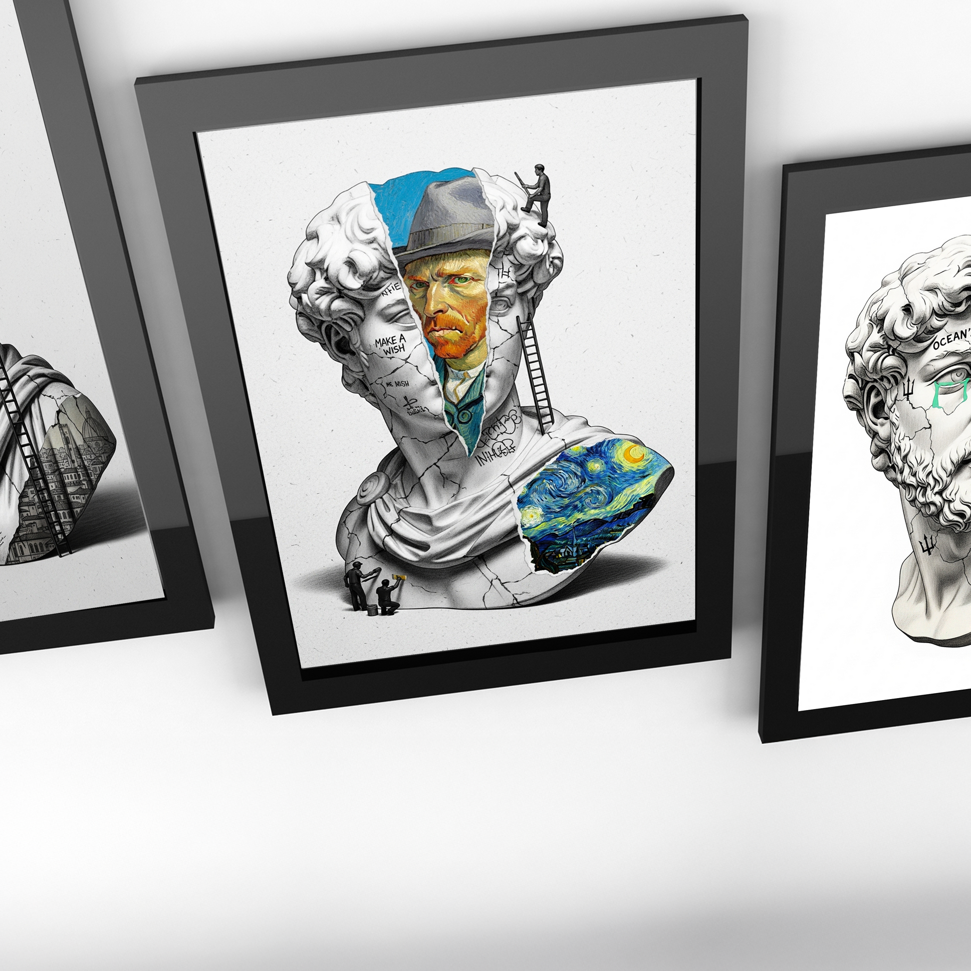 Luiff Art'ın bu çarpıcı tasarımı, sanat tarihinin iki devini, Michelangelo'nun David büstünü ve Van Gogh'un eşsiz dünyasını bir araya getiriyor. Bu, bir sanatçının zihninin sürrealist bir portresidir.