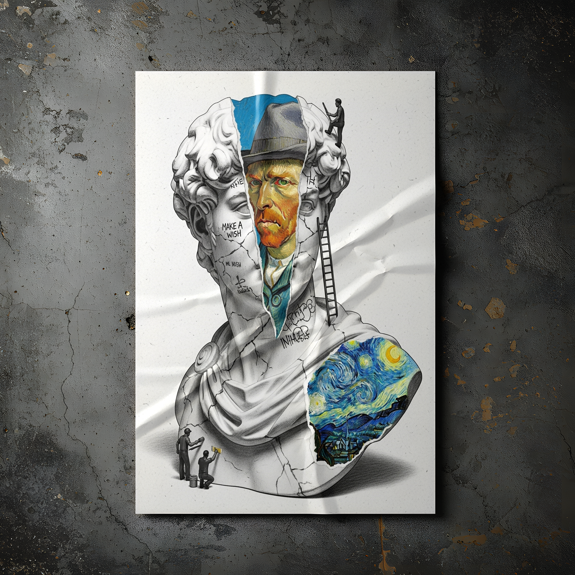 Bu orijinal "Altered Art" (Değiştirilmiş Sanat) kolajı, David büstünün klasik formunu, Van Gogh'un yoğun otoportresi (zihin) ve "Yıldızlı Gece"nin (beden/ruh) fırtınalı enerjisiyle doldurur. Grafiti tarzı yazılar, esere modern ve asi bir karakter katar.