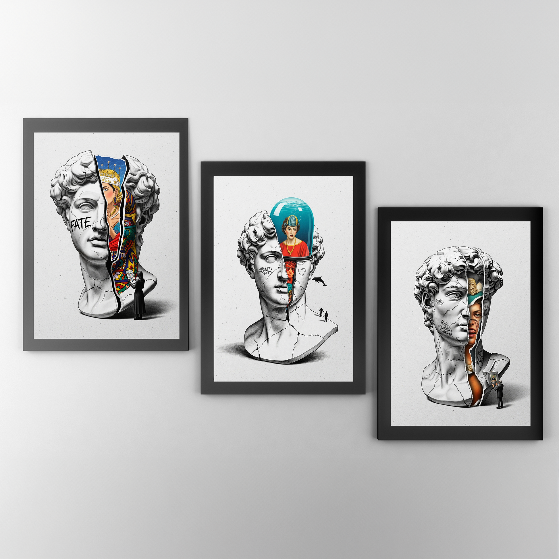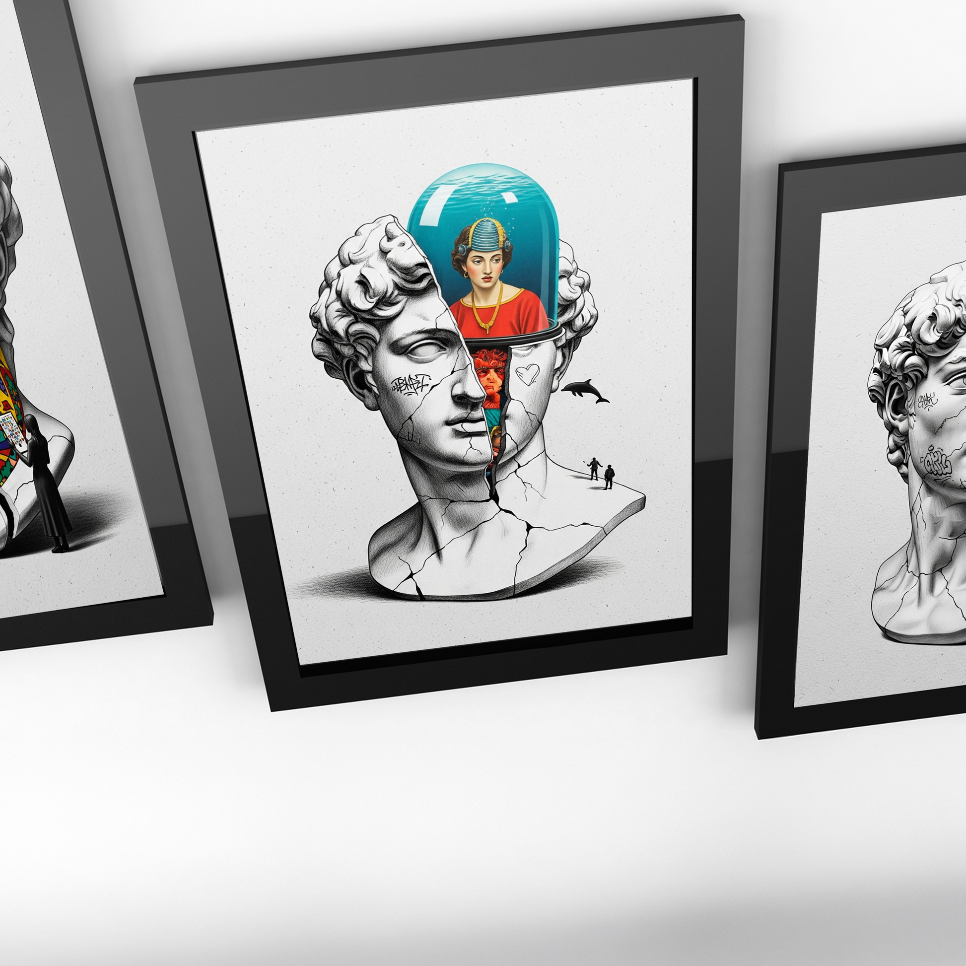 Luiff Art'ın bu gizemli ve sürrealist tasarımı, "Akvaryum Zihin" temasını işliyor. Klasik David büstü, zihninde "hapsedilmiş" veya "korunmuş" Rönesans portrelerini barındıran bir fanusu/akvaryumu ortaya çıkarmak için parçalanıyor.