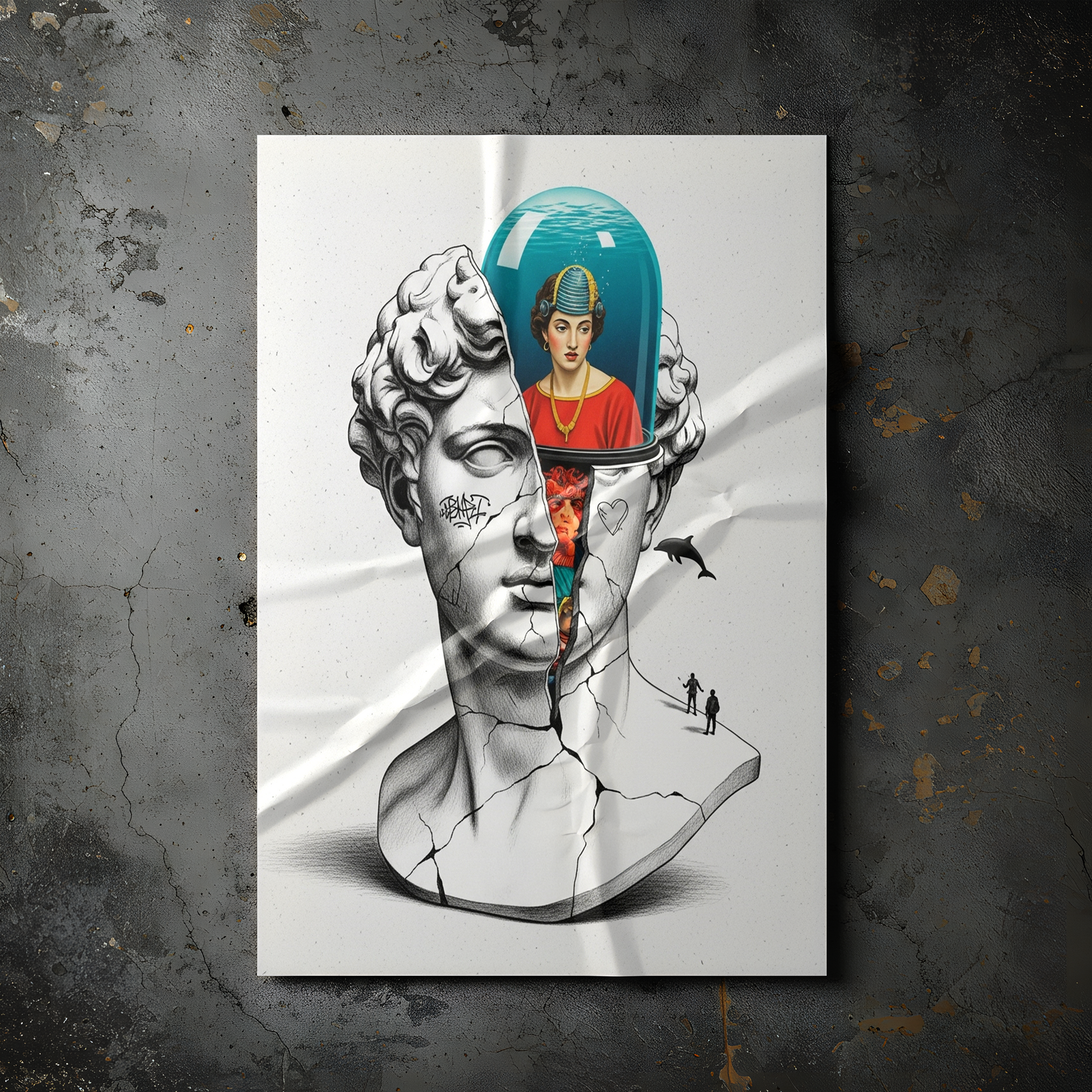 Bu orijinal "Altered Art" (Değiştirilmiş Sanat) kolajı, mermerin katı formu ile suyun akışkanlığı arasındaki tezatlığı vurgular. Grafiti dövmeleri ve dışarıdaki yunus figürü, bu "iç dünya"nın dışarıyla olan karmaşık ilişkisini gösterir.
