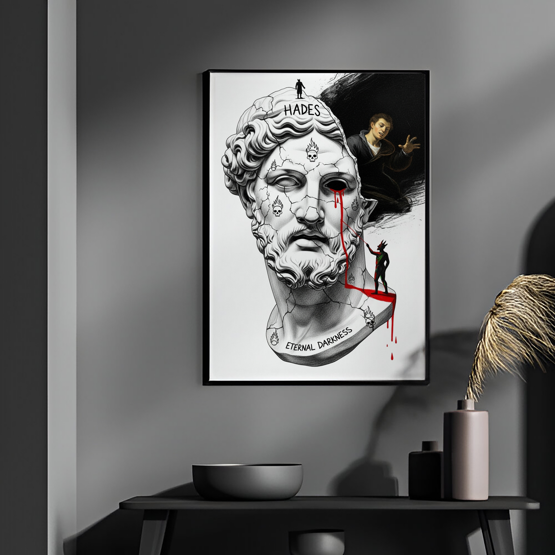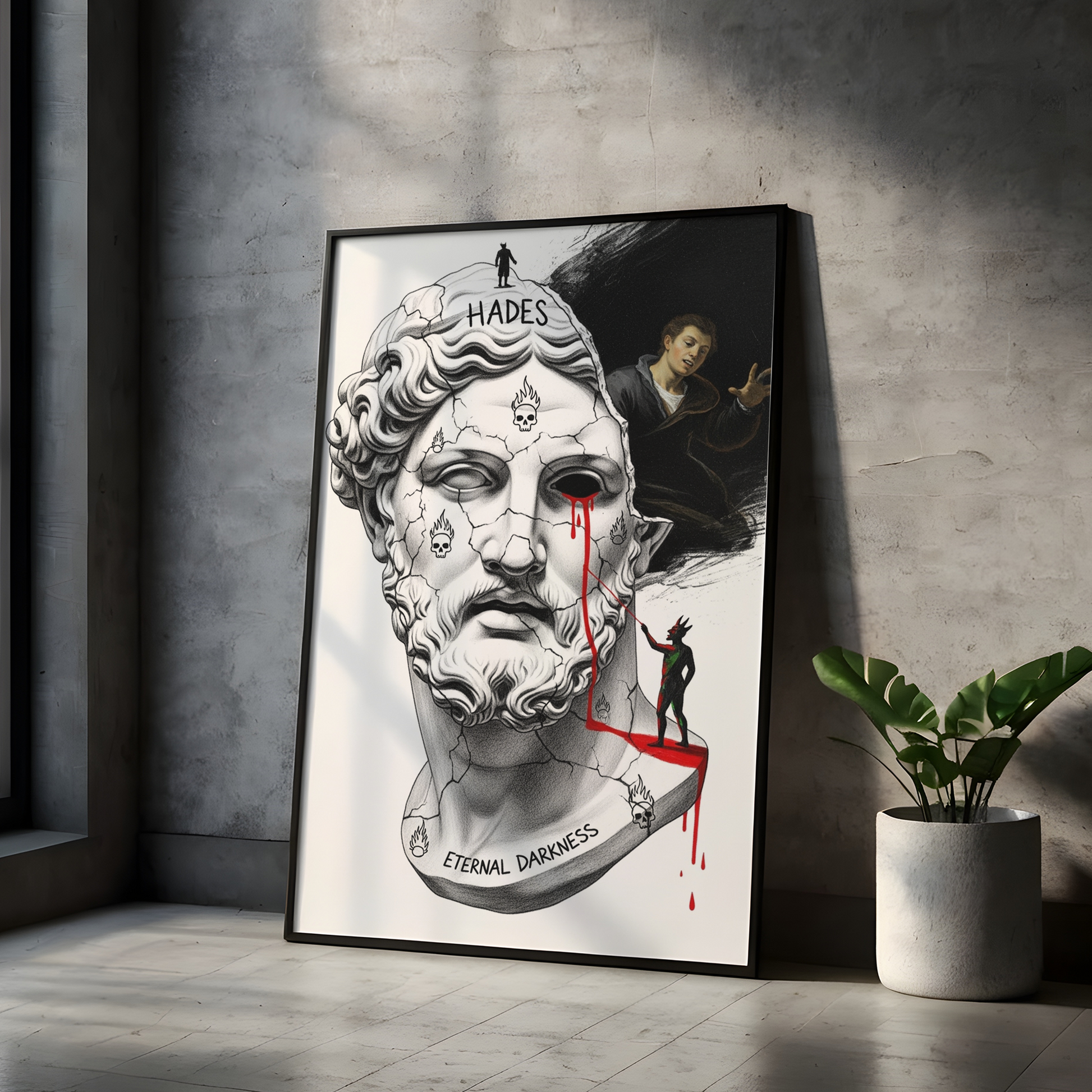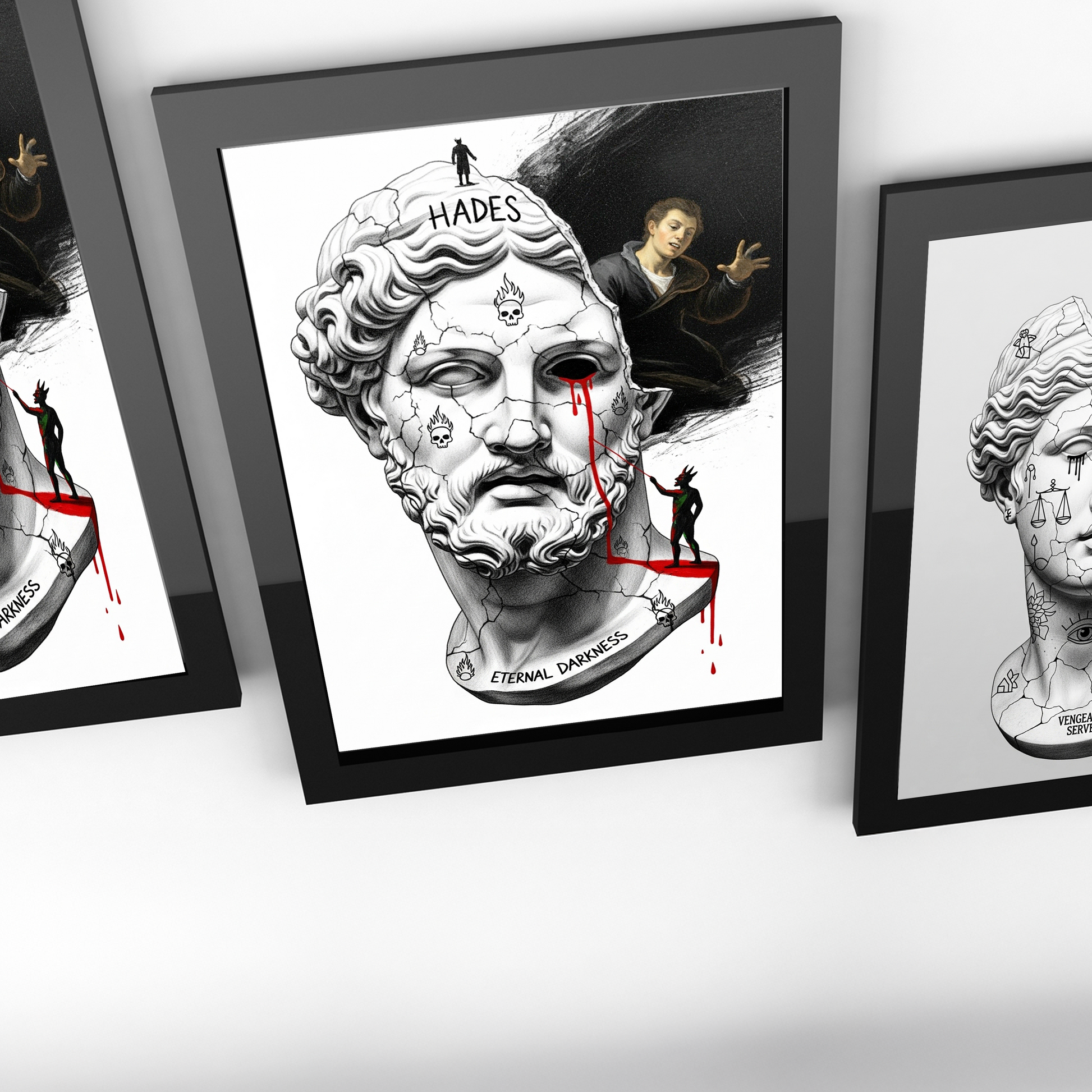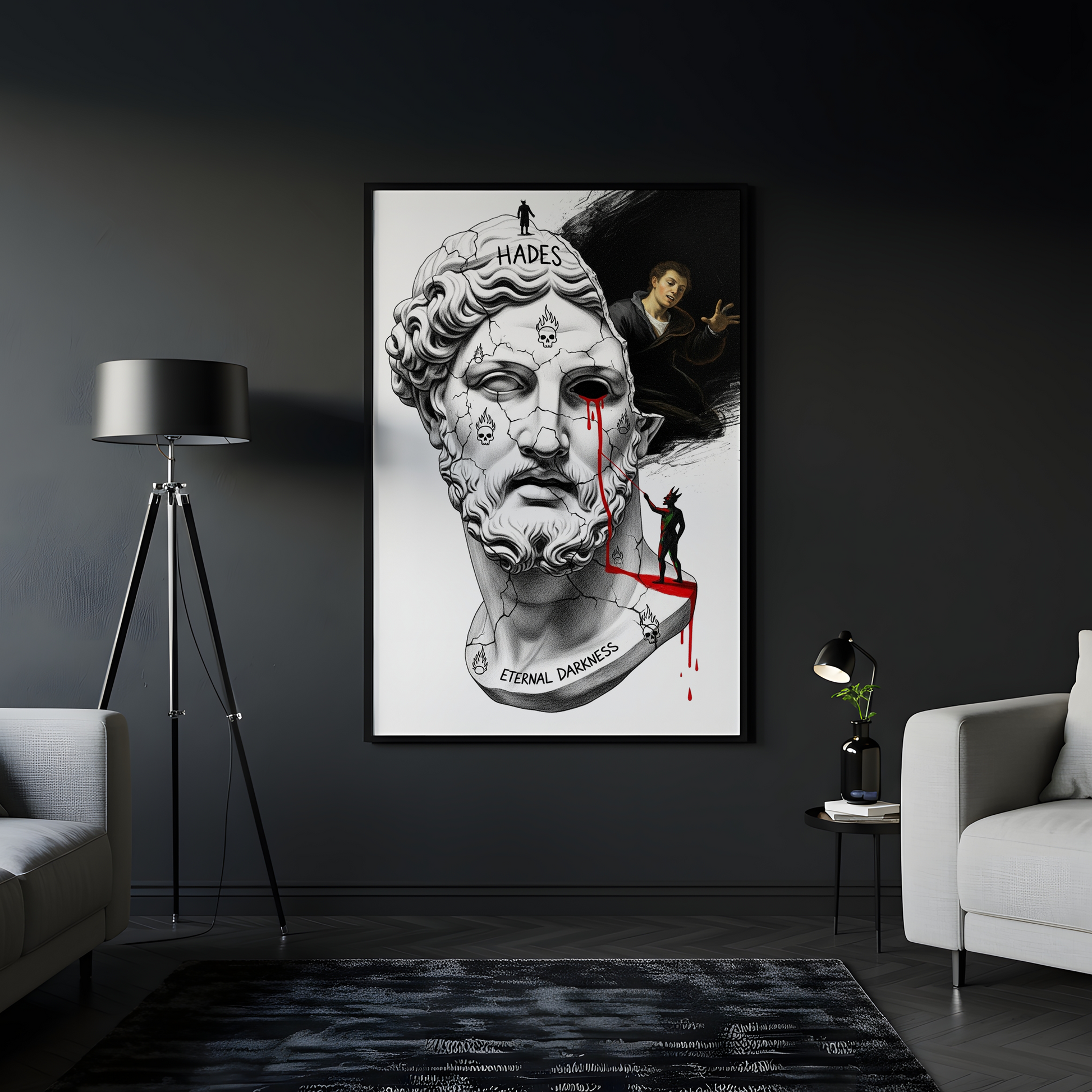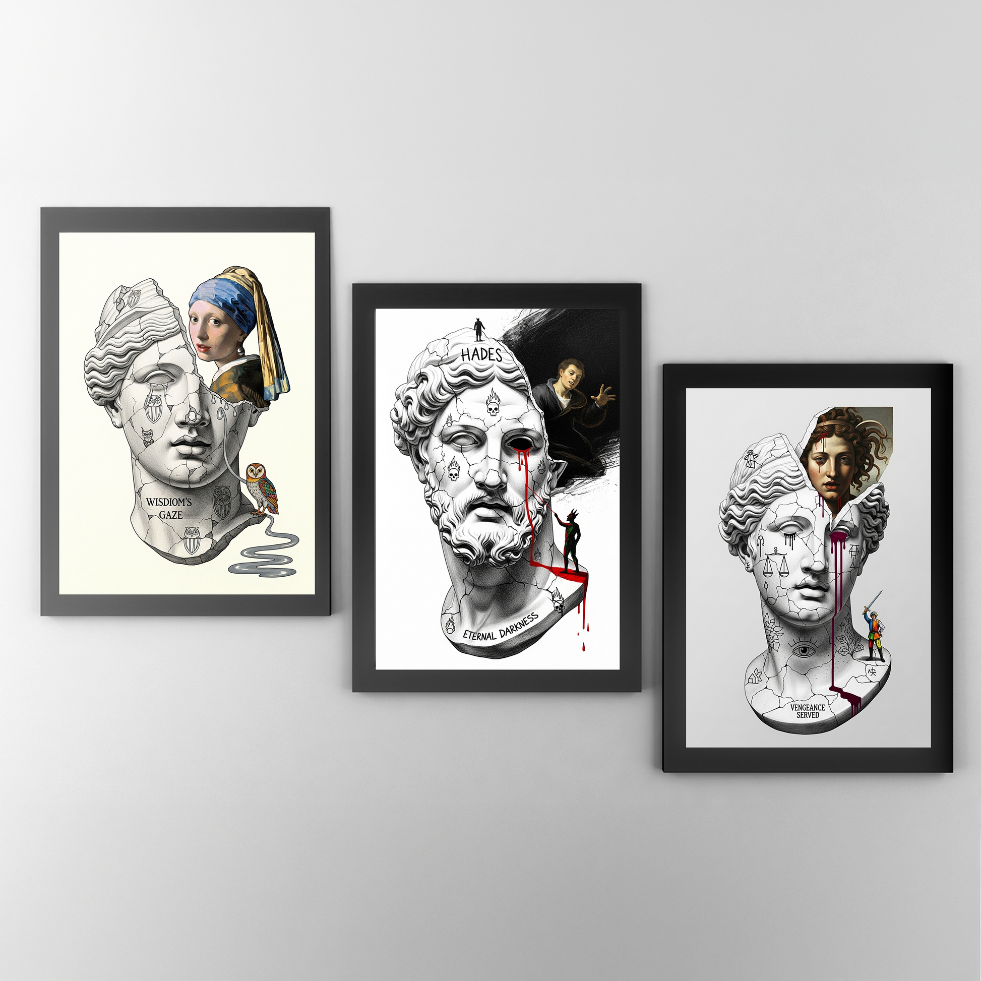 Luiff Art'ın en karanlık ve en güçlü tasarımlarından biri: "Eternal Darkness". Bu orijinal kolaj, klasik mitolojiyi, Caravaggio'nun ışık-gölge draması ve gotik bir estetikle birleştiriyor.