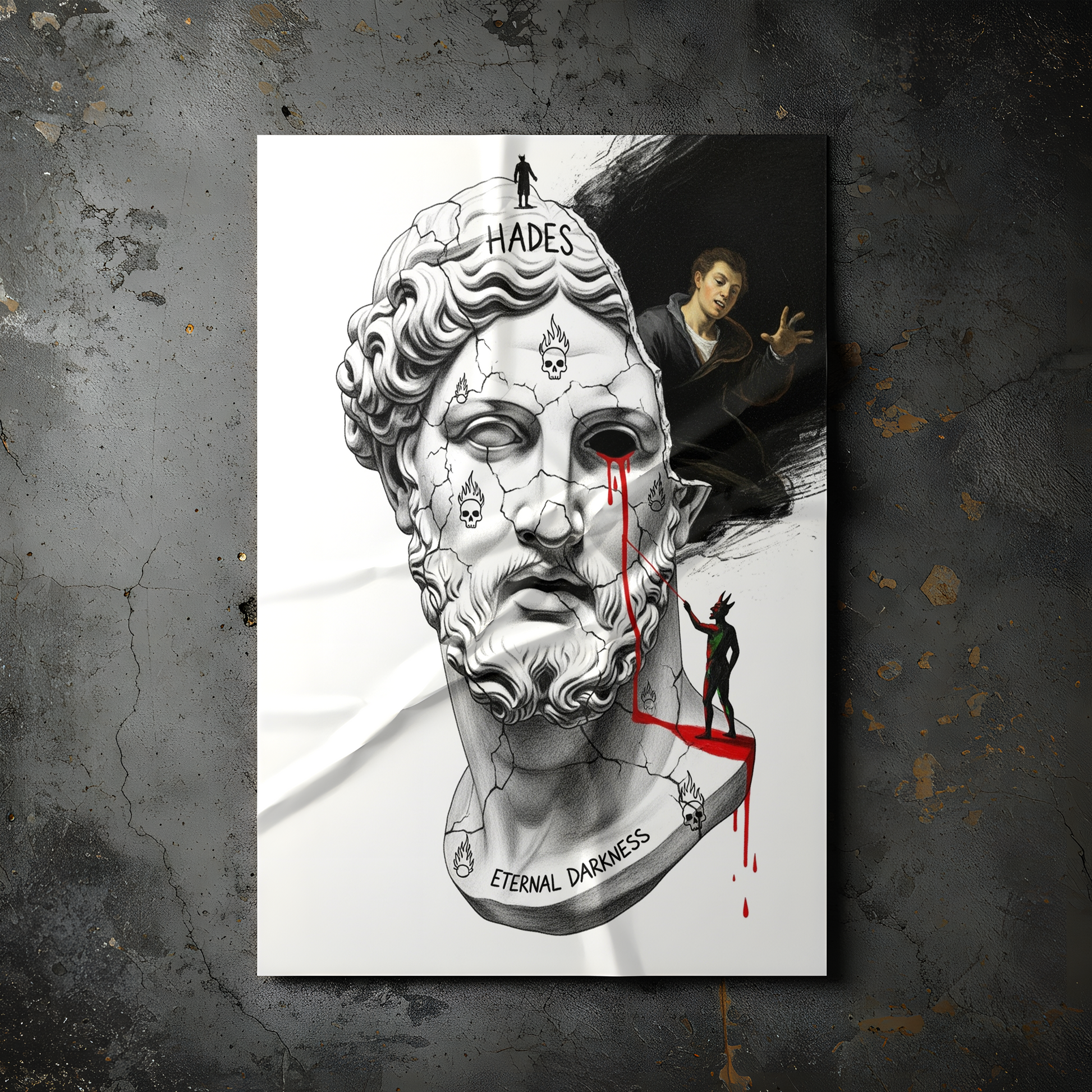Bu "Altered Art" (Değiştirilmiş Sanat) eseri, "HADES"in (Yeraltı Dünyası) soğuk ve sert formunu, içindeki korku (Caravaggio portresi) ve acı (kanlı gözyaşları) ile sorgular. Omuzda duran küçük şeytan figürü, bu "sonsuz karanlık" anlatısını tamamlar.