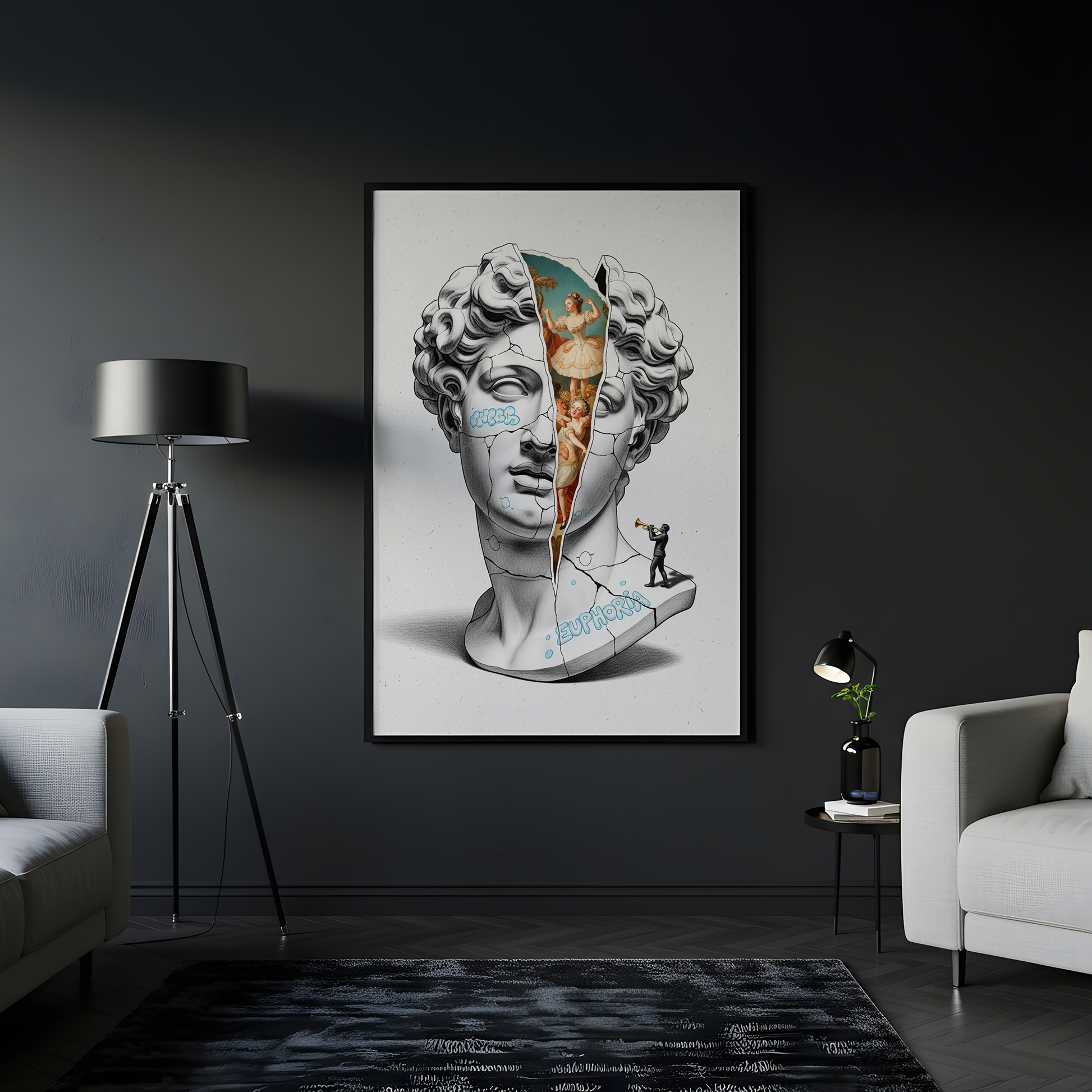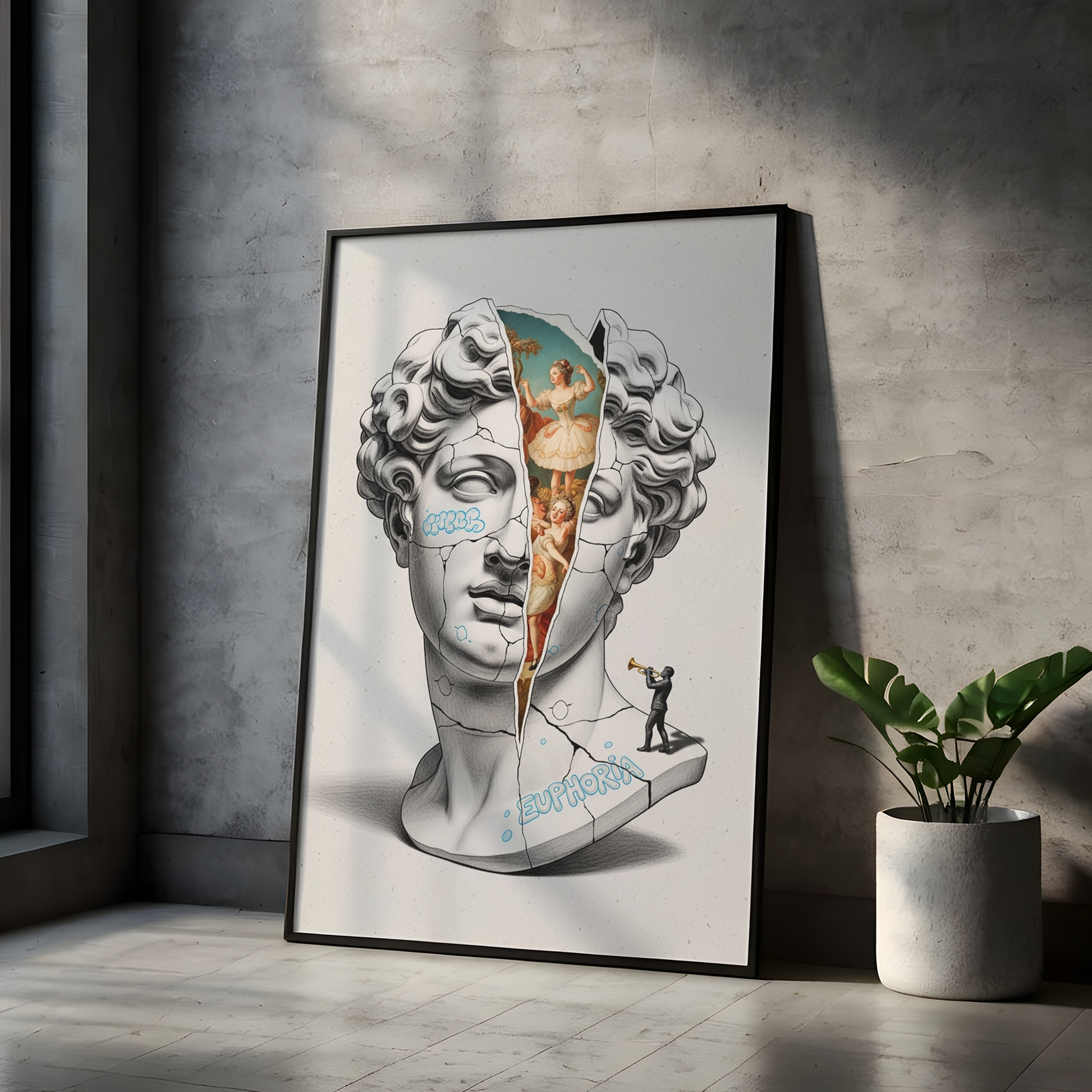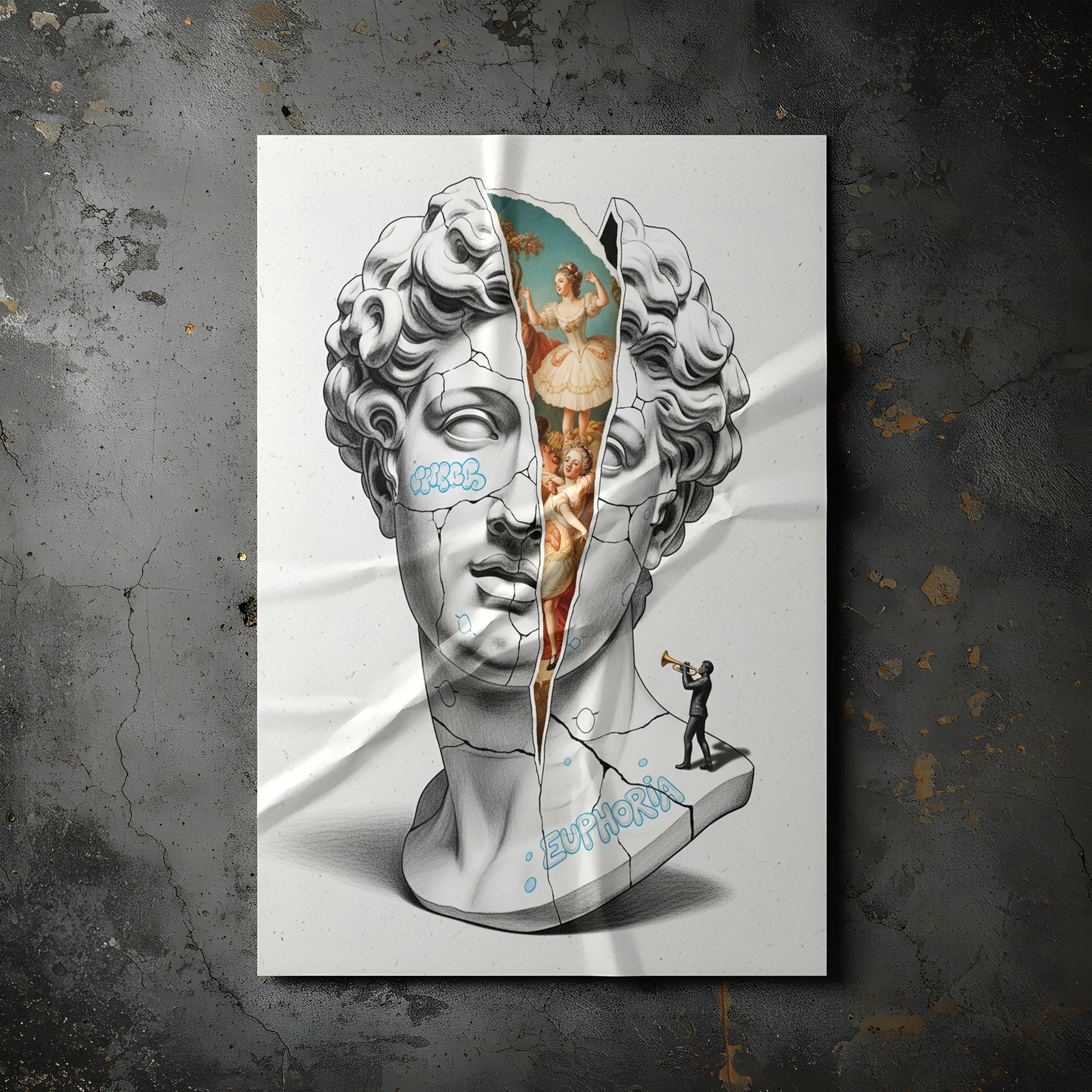 Luiff Art'ın bu neşeli ve coşkulu tasarımı, "Euphoria" (Coşku) temasıyla, David büstünün klasik formunu, bale ve müziğin "coşkulu" dünyasıyla birleştiriyor.
