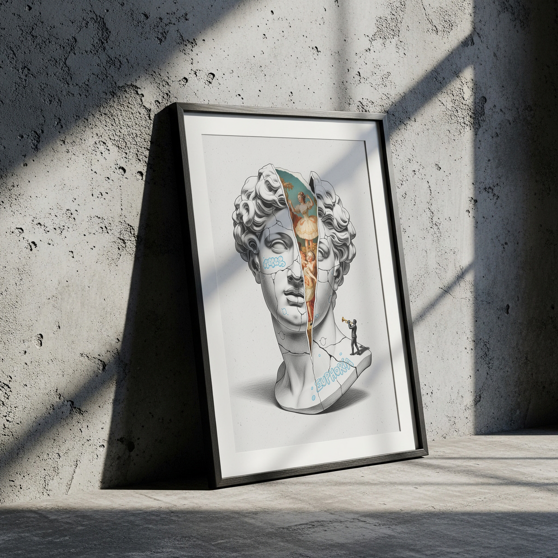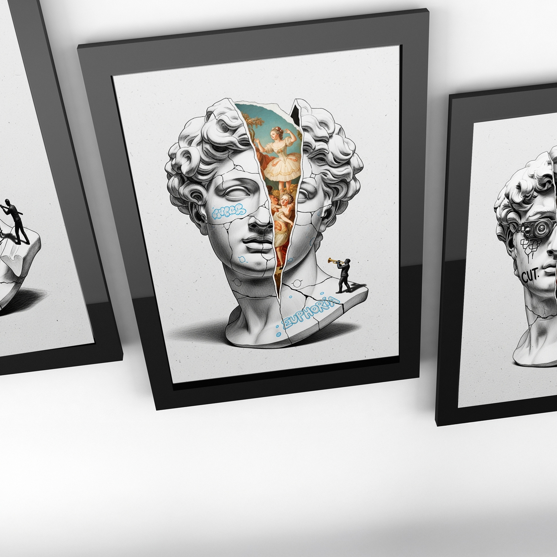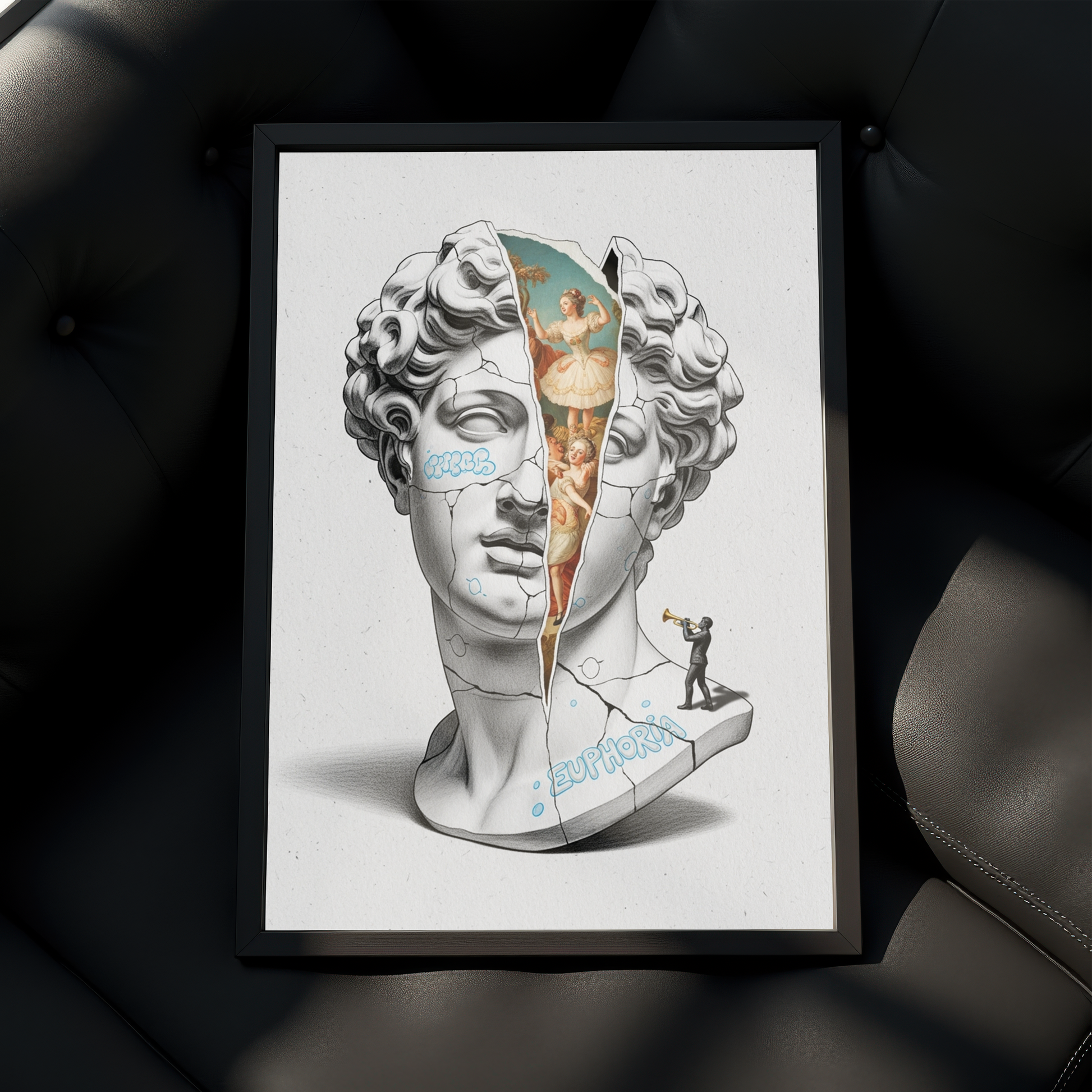 Luiff Art'ın bu neşeli ve coşkulu tasarımı, "Euphoria" (Coşku) temasıyla, David büstünün klasik formunu, bale ve müziğin "coşkulu" dünyasıyla birleştiriyor.