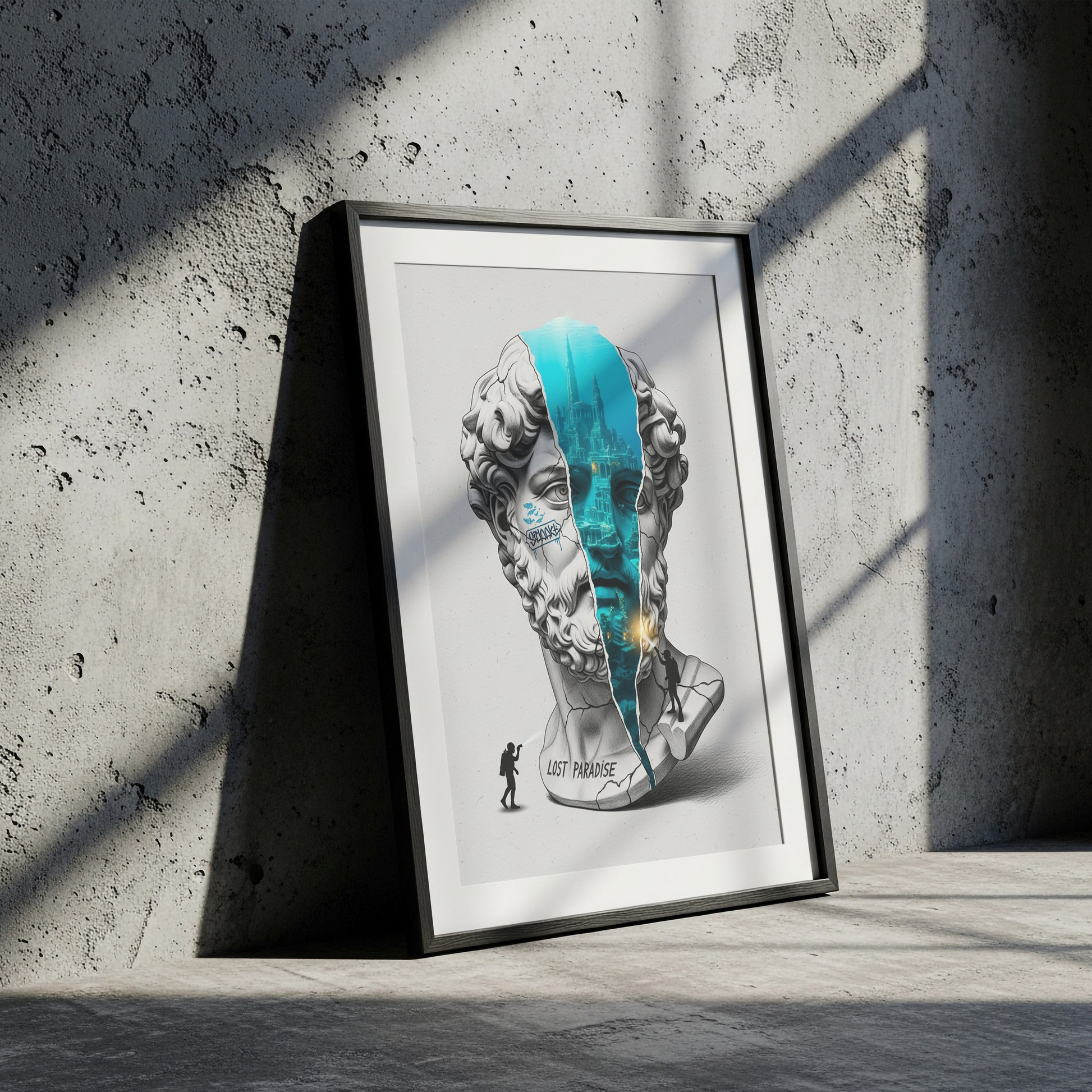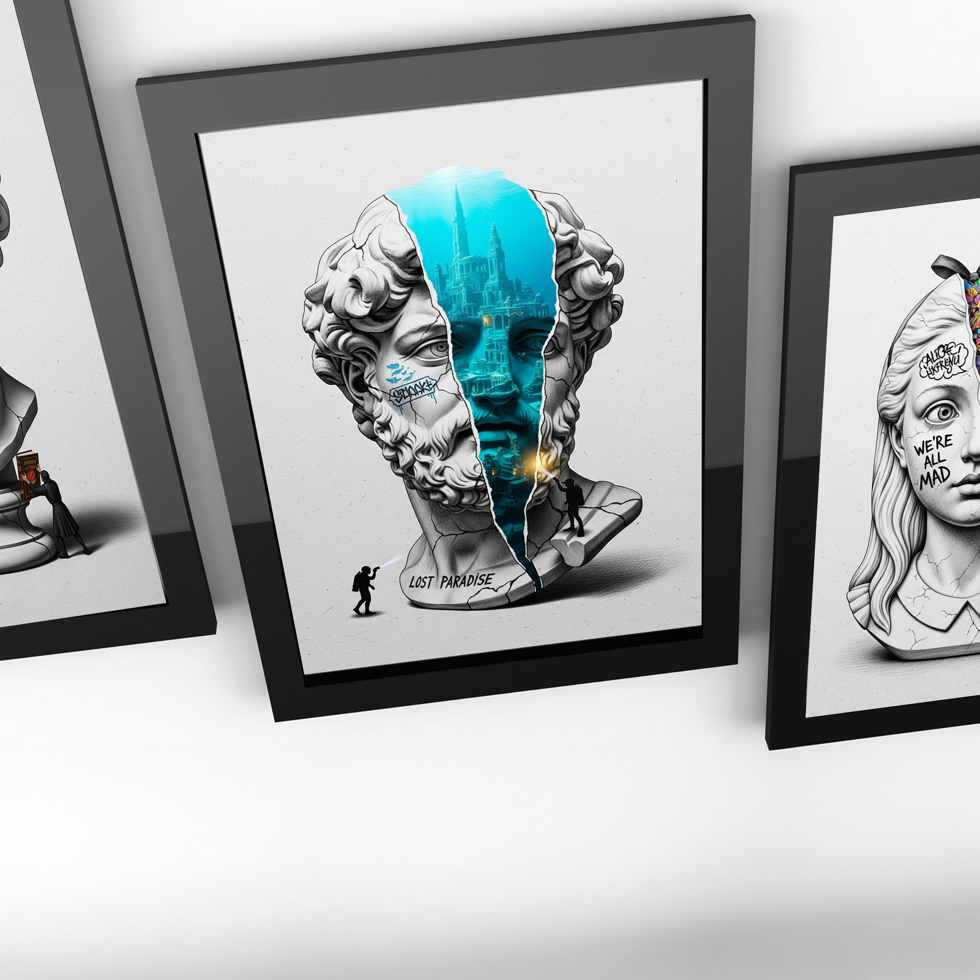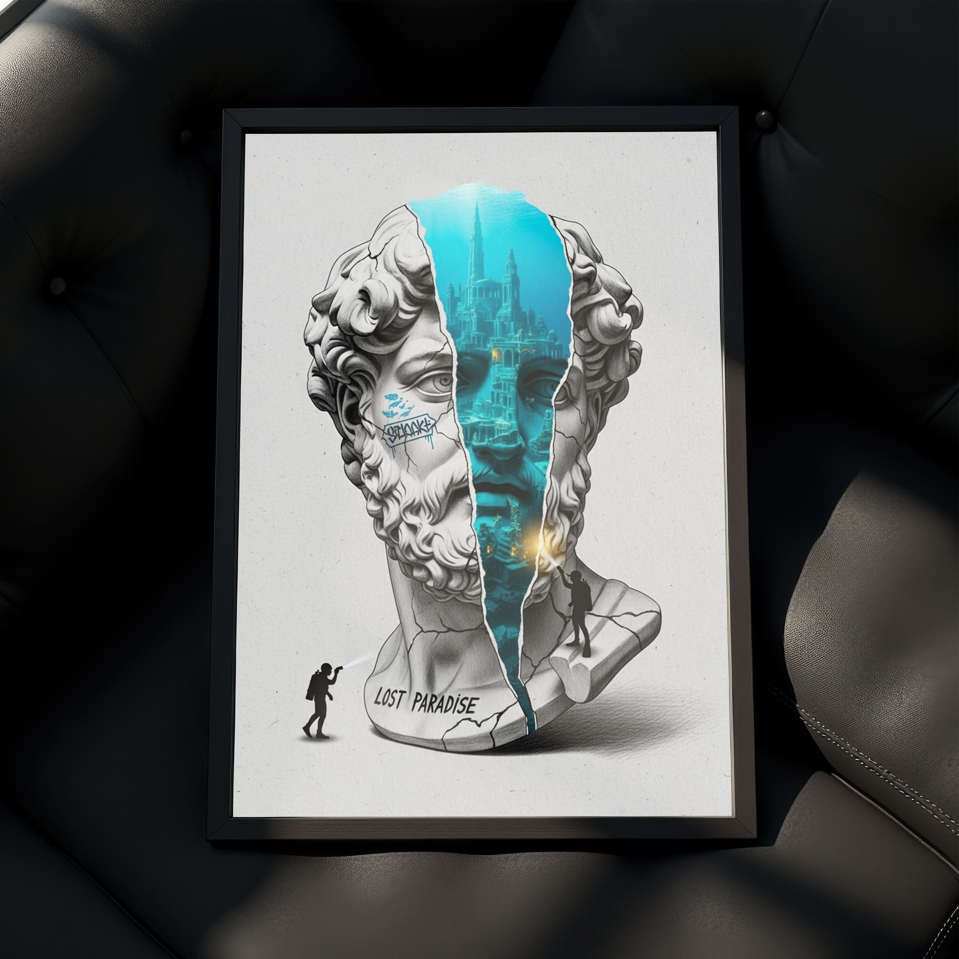Bu orijinal "Altered Art" (Değiştirilmiş Sanat) kolajı, klasik bir mitin içinde saklı olan başka bir miti, "Atlantis"i araştırır. Büstün zihnindeki batık şehir ve onu keşfeden küçük dalgıç figürleri, bu "Kayıp Cennet"in sırrını aralar.