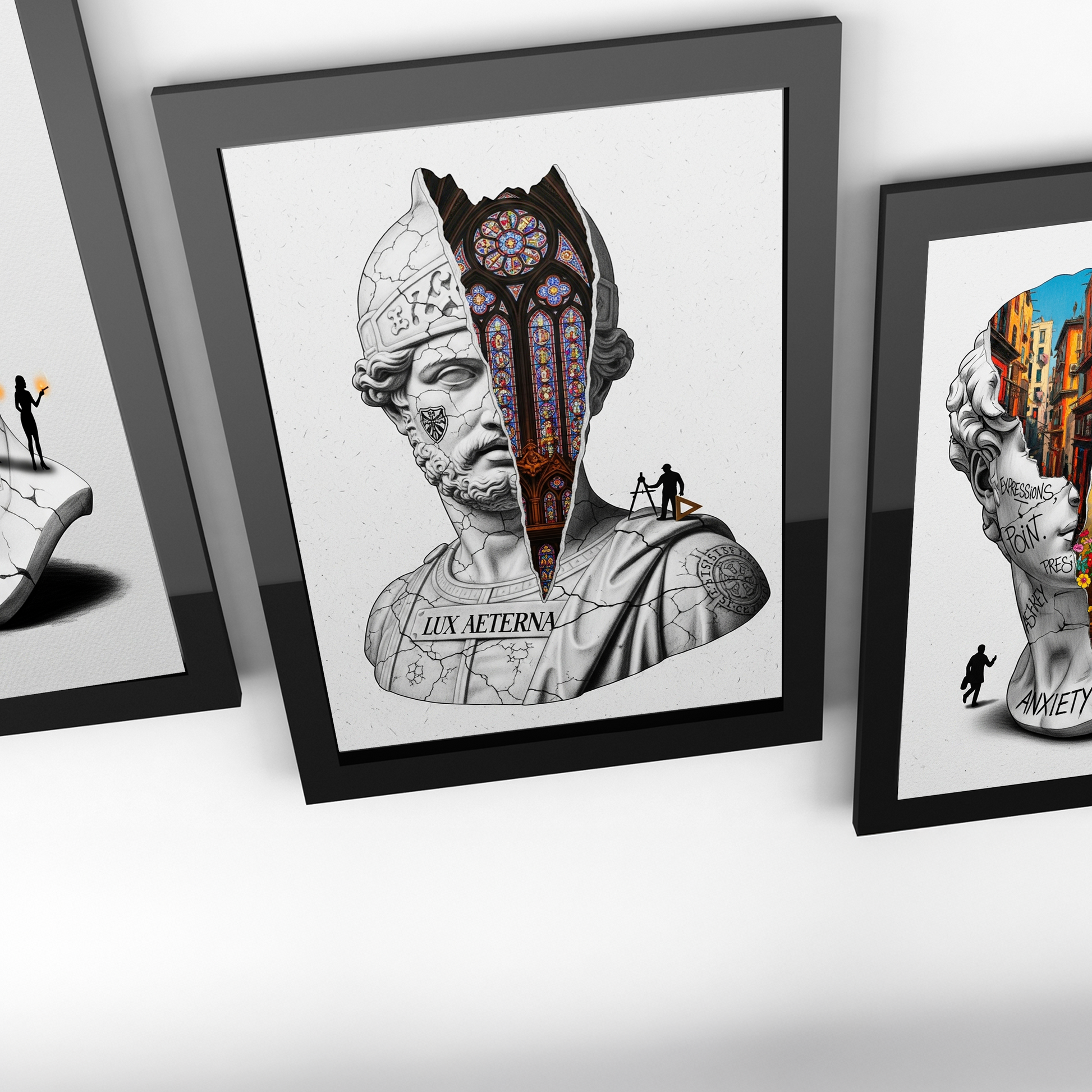 Bu orijinal "Altered Art" (Değiştirilmiş Sanat) kolajı, insan yapımı düzenin (büst) ve ilahi güzelliğin (vitray) arasındaki ilişkiyi sorgular. Mermer, "sonsuz ışığın" gücüyle çatlar ve içindeki güzelliği ortaya çıkarır. Omuzdaki mimar figürü, bu ilahi yapıyı inceler.