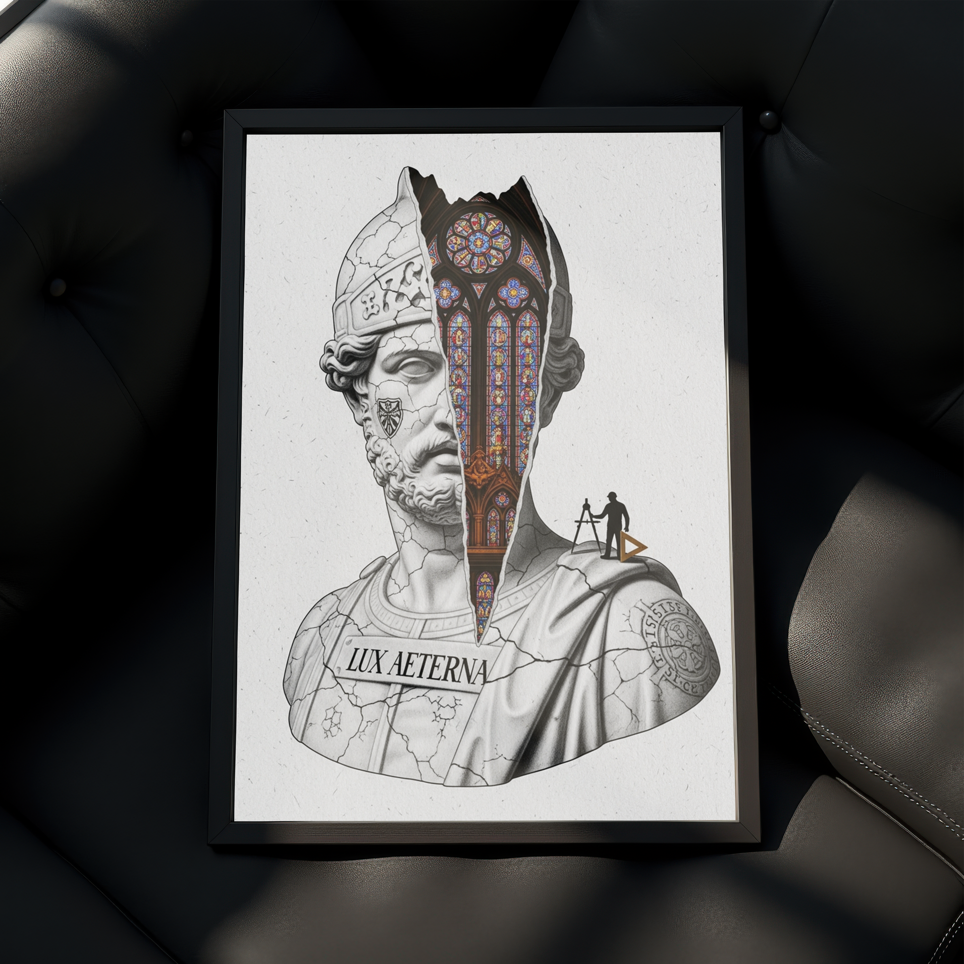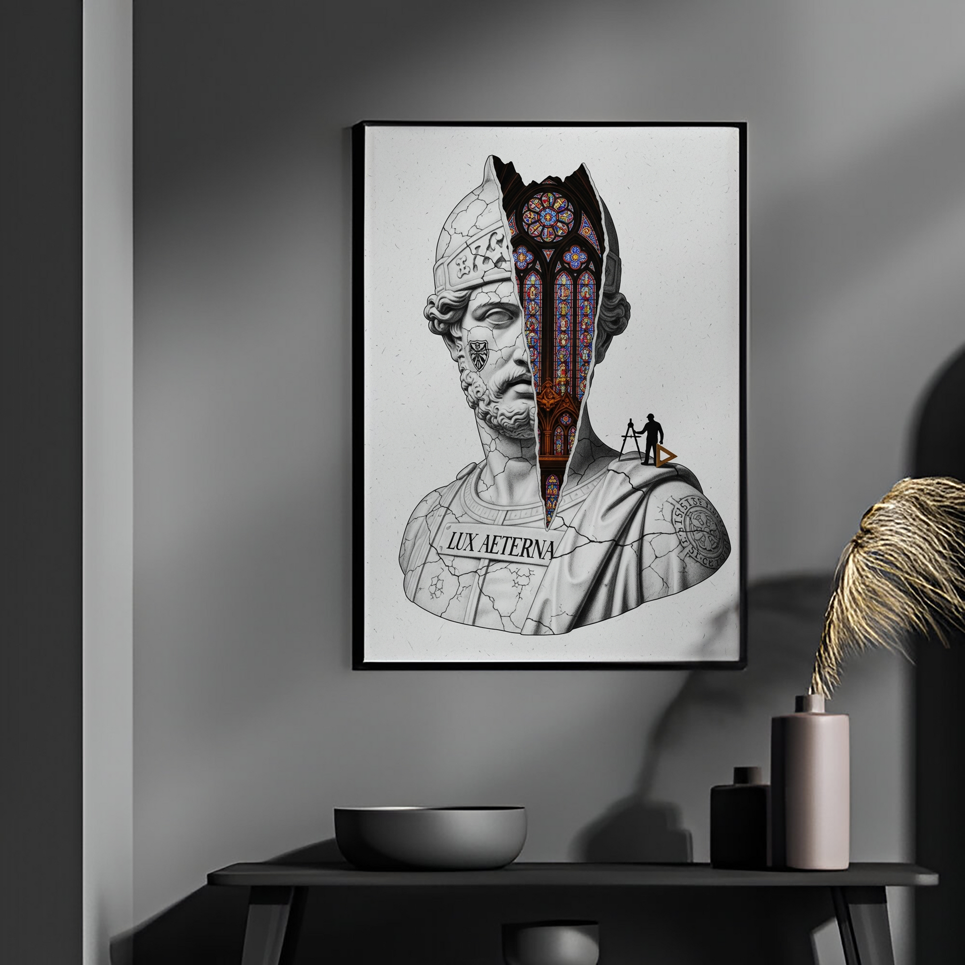 Luiff Art'ın bu görkemli tasarımı, "Lux Aeterna" (Sonsuz Işık) temasıyla, klasik Roma büstünün katı formunu, Gotik bir katedral penceresinin renkli ve ilahi ışığıyla birleştiriyor.