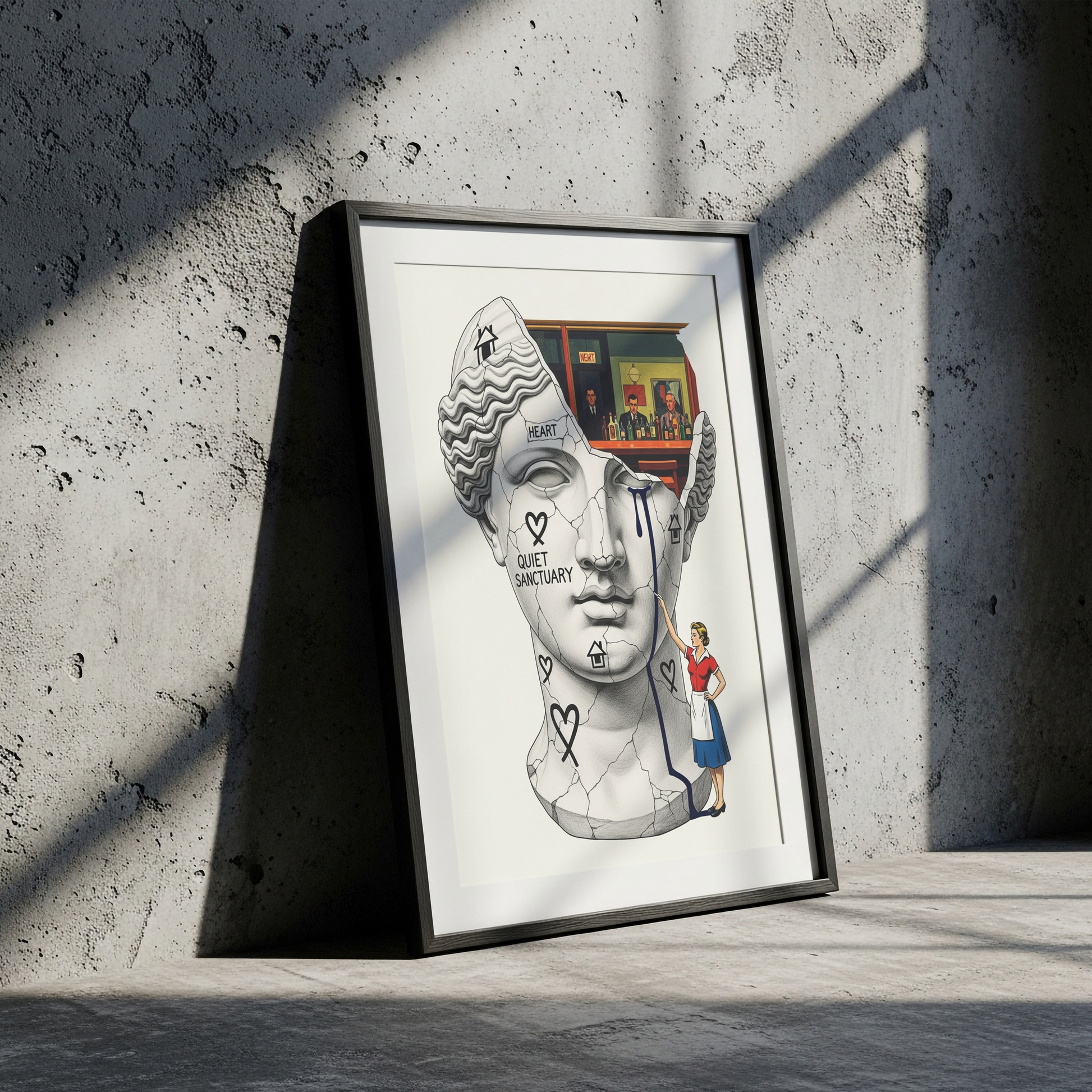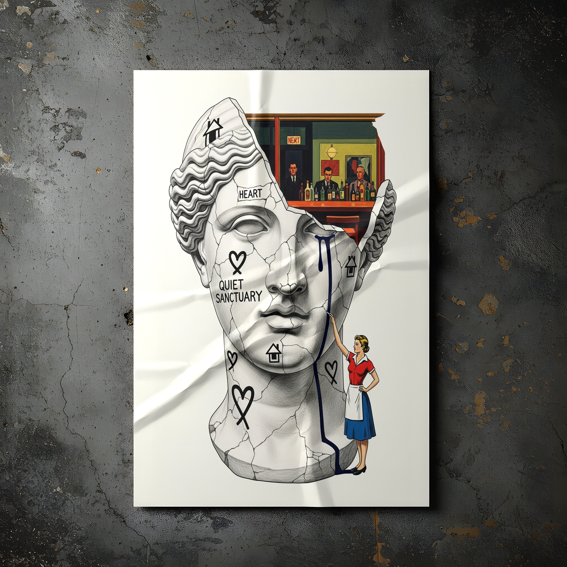 Bu orijinal "Altered Art" (Değiştirilmiş Sanat) kolajı, idealize edilmiş güzelliğin (Venüs) içinde saklı olan modern kent "yalnızlığını" ve "melankolisini" (Hopper) sorgular. Büstün üzerindeki "Kalp" ve "Ev" dövmeleri, bu "sessiz sığınak" kavramına ironik bir göndermedir.