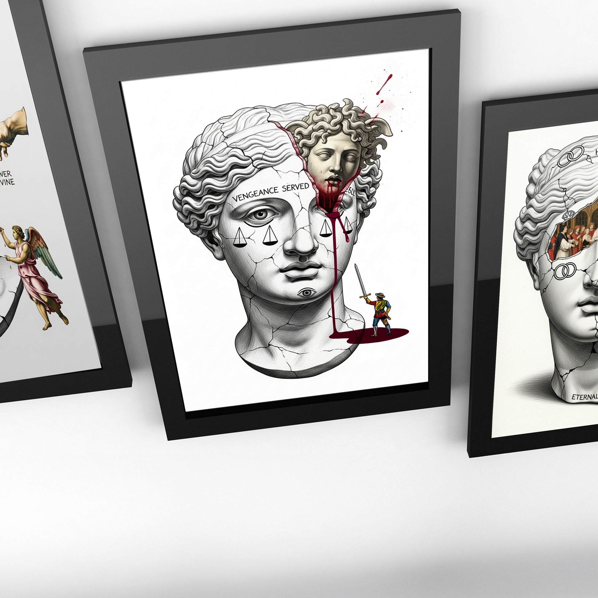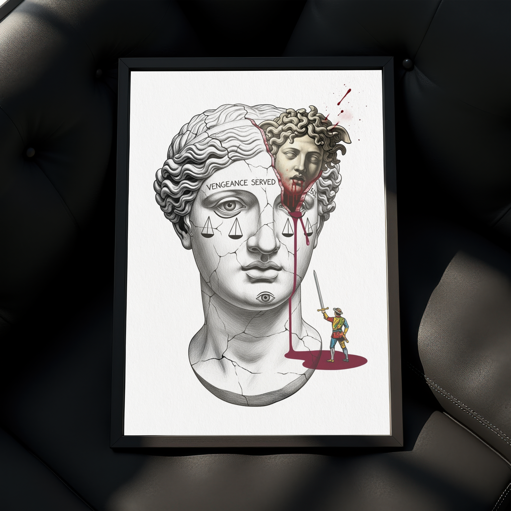 Bu orijinal "Altered Art" (Değiştirilmiş Sanat) kolajı, Adalet (Themis) büstünün idealize edilmiş formunun, içinde "Medusa'nın intikamı"nı nasıl barındırdığını gösterir. Terazi dövmeleri ve kanlı gözyaşları, bu "Gotik" ve "Dark Academia" estetiğini güçlendirir.