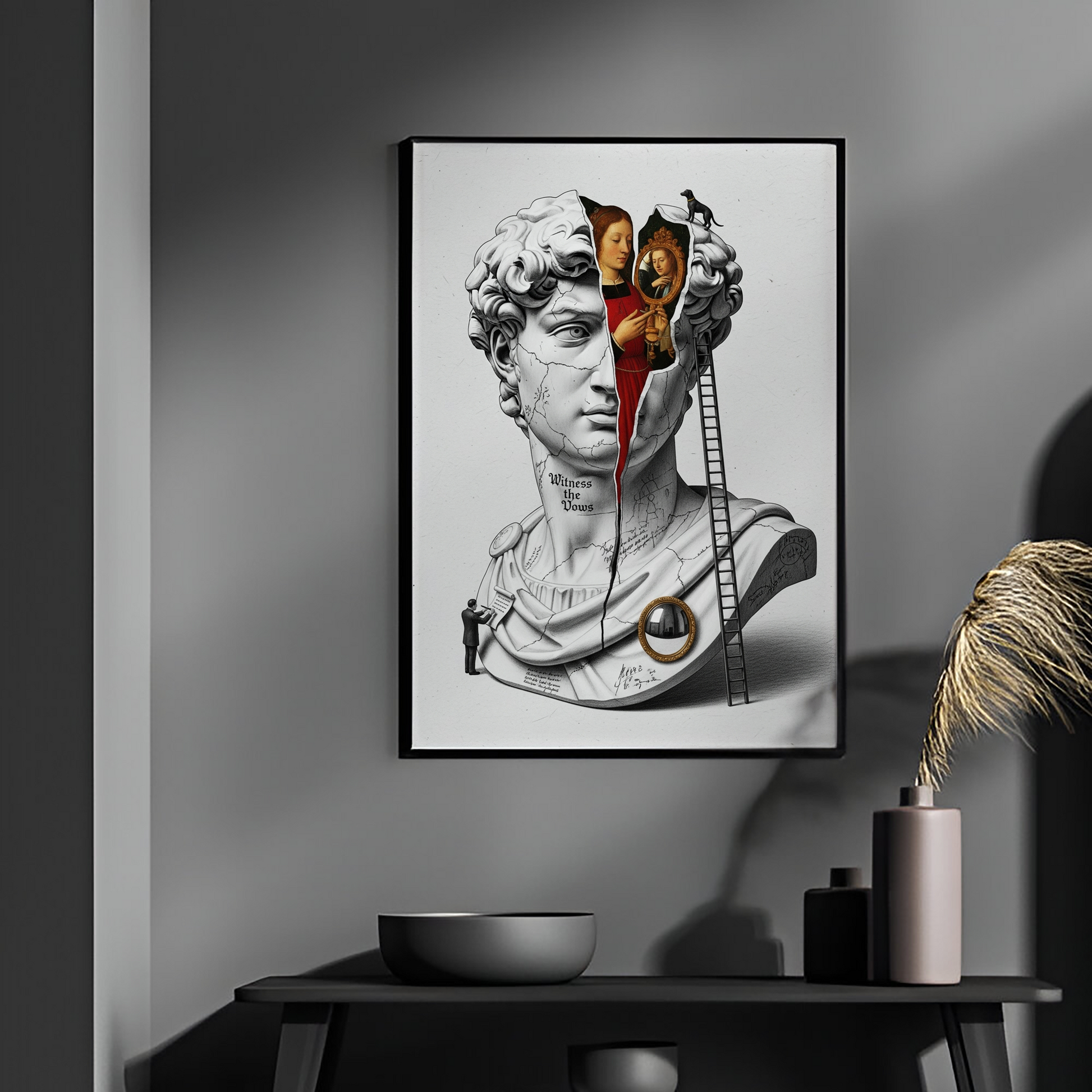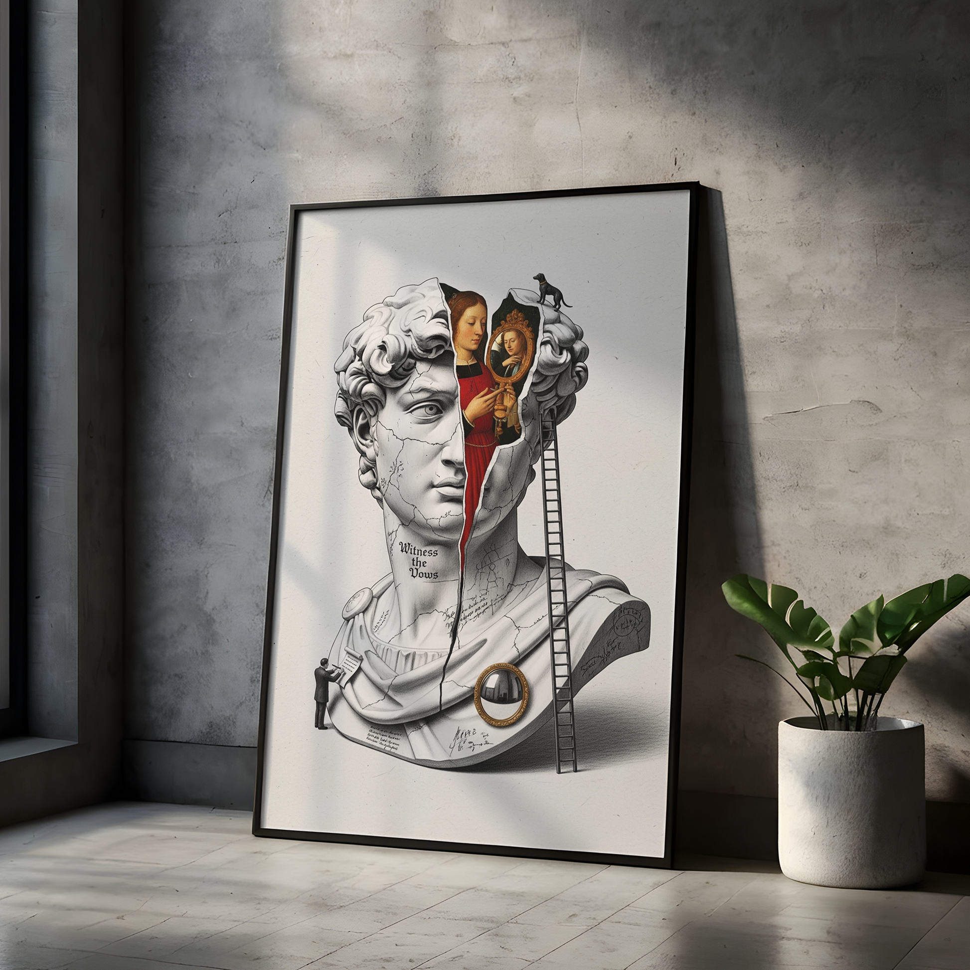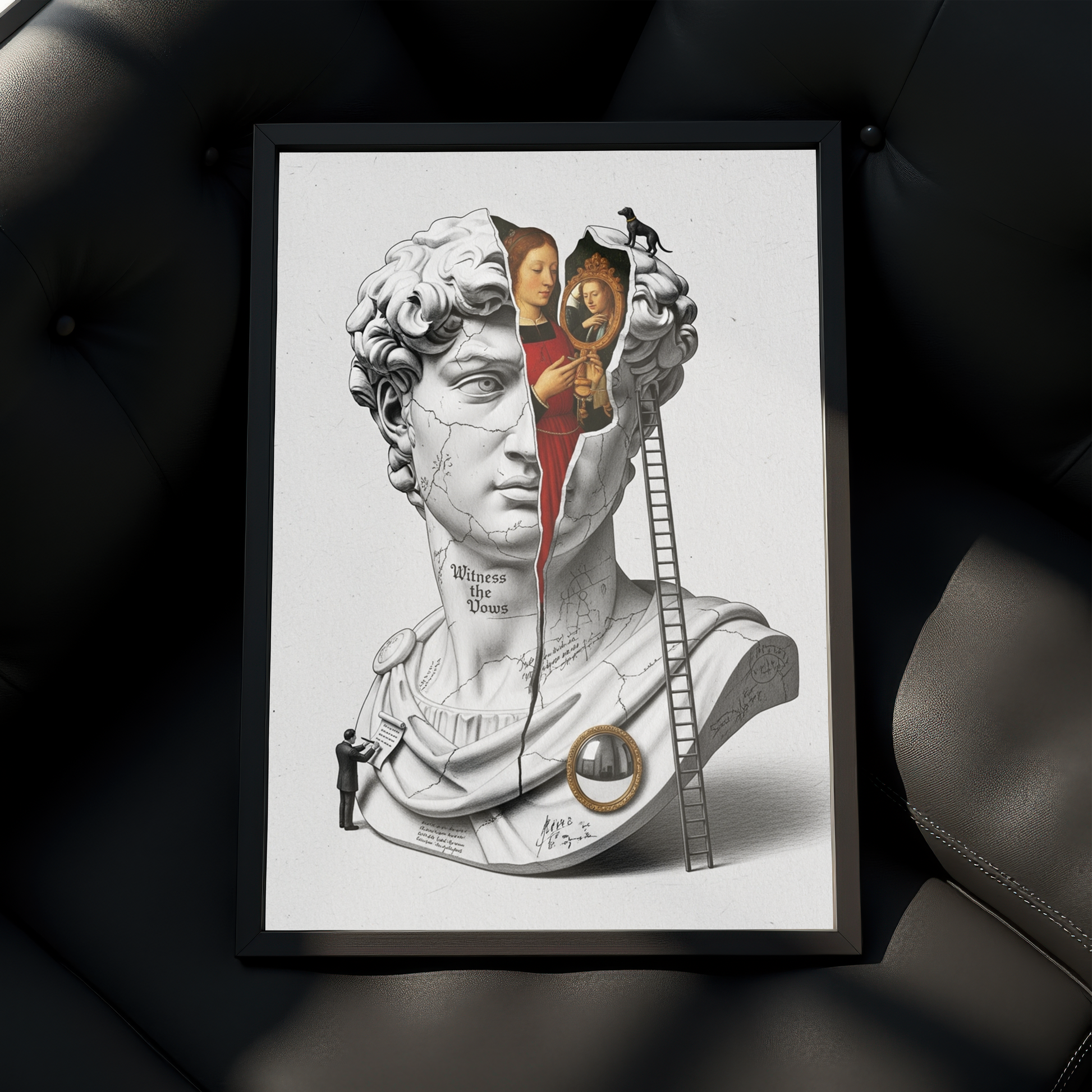 Luiff Art'ın bu gizemli tasarımı, "Witness the Vows" (Yeminlere Tanıklık Et) temasıyla, klasik bir David büstünün mermer hafızasını, bir Rönesans portresiyle dolduruyor.