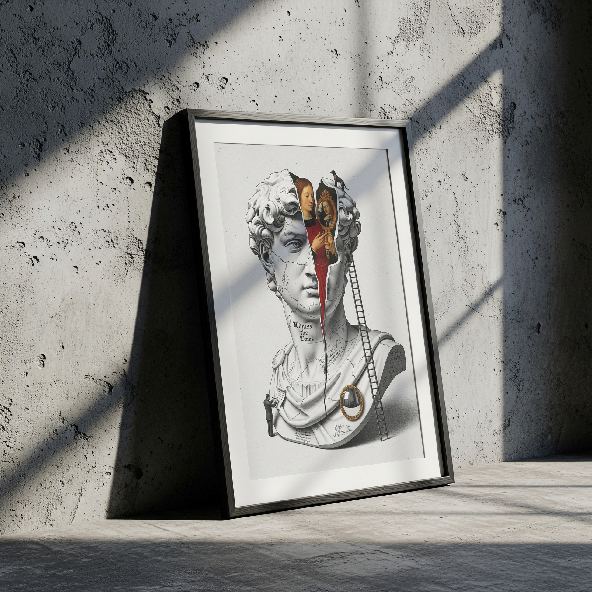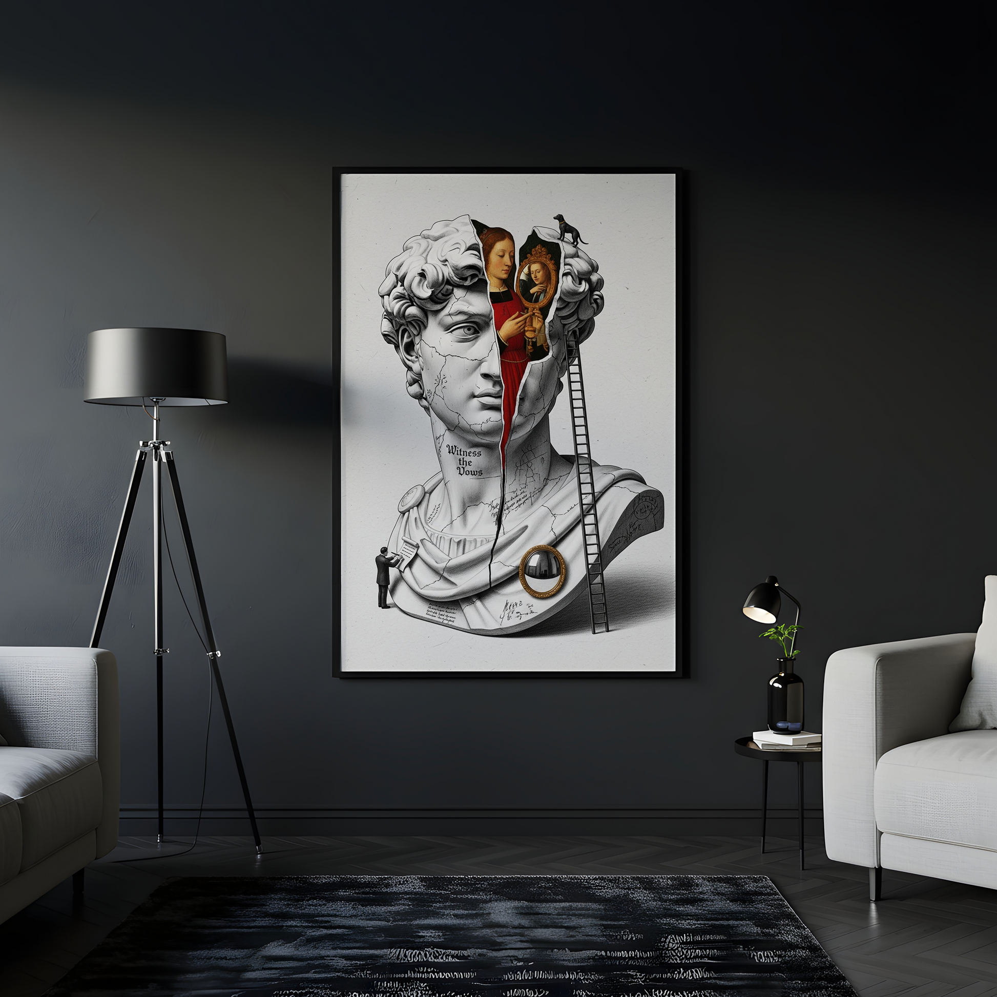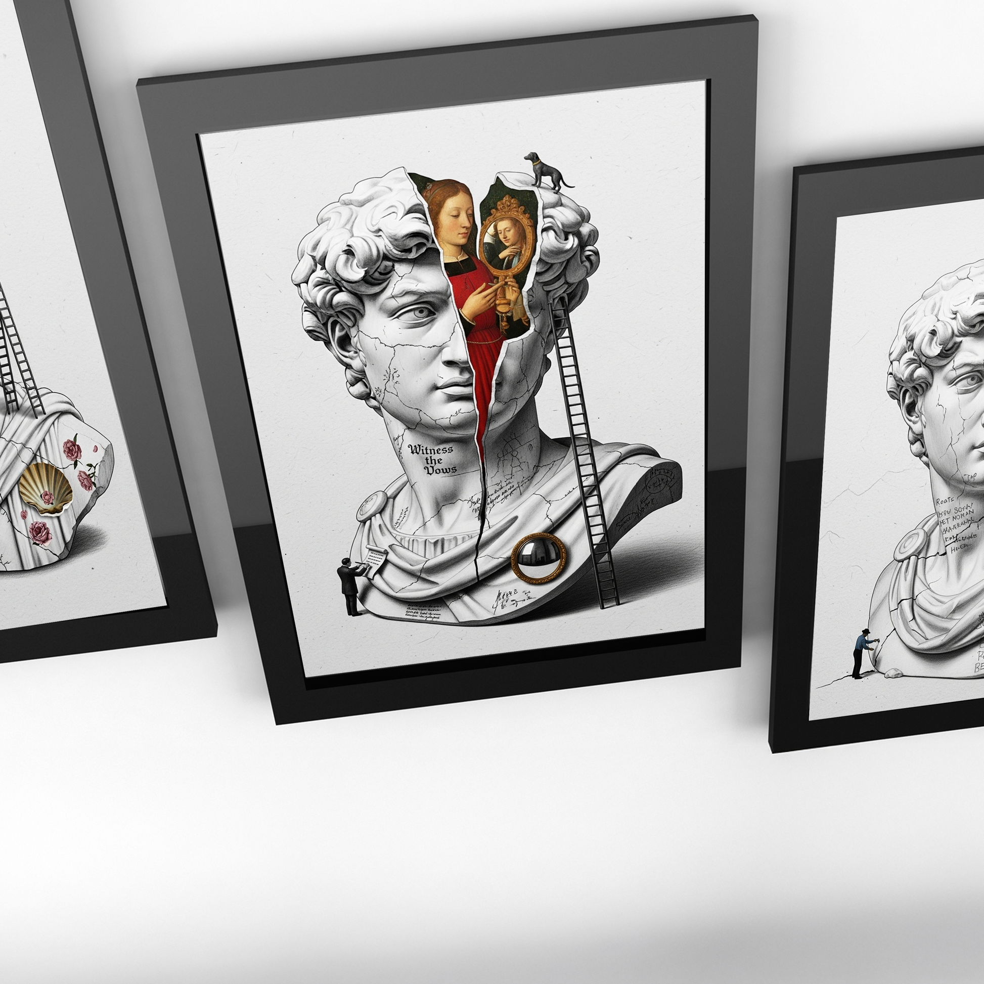 Luiff Art'ın bu gizemli tasarımı, "Witness the Vows" (Yeminlere Tanıklık Et) temasıyla, klasik bir David büstünün mermer hafızasını, bir Rönesans portresiyle dolduruyor.
